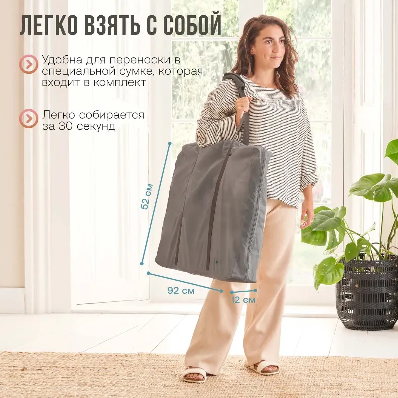 Уникальный механизм позволяет сложить кроватку за 30 секунд до компактных размеров. В сложенном виде колыбелька не займет много места при хранении и транспортировке. А в целях защиты от загрязнений и механических повреждений в комплект уже входит сумка-чехол с удобными ручками.