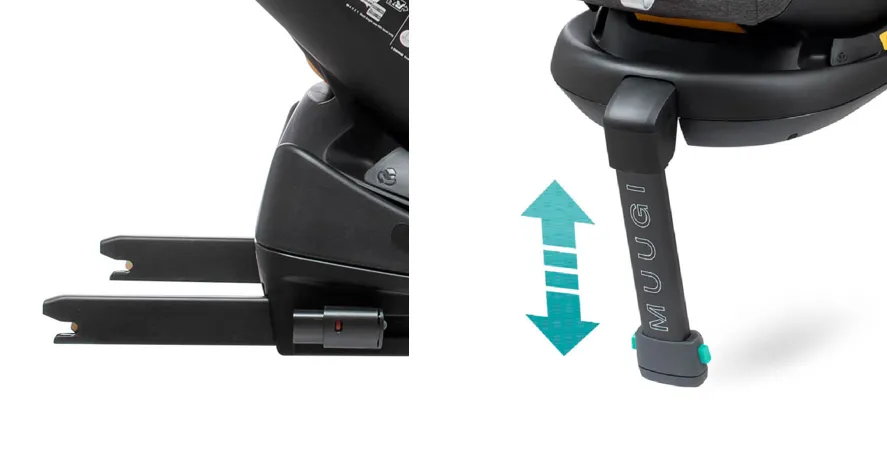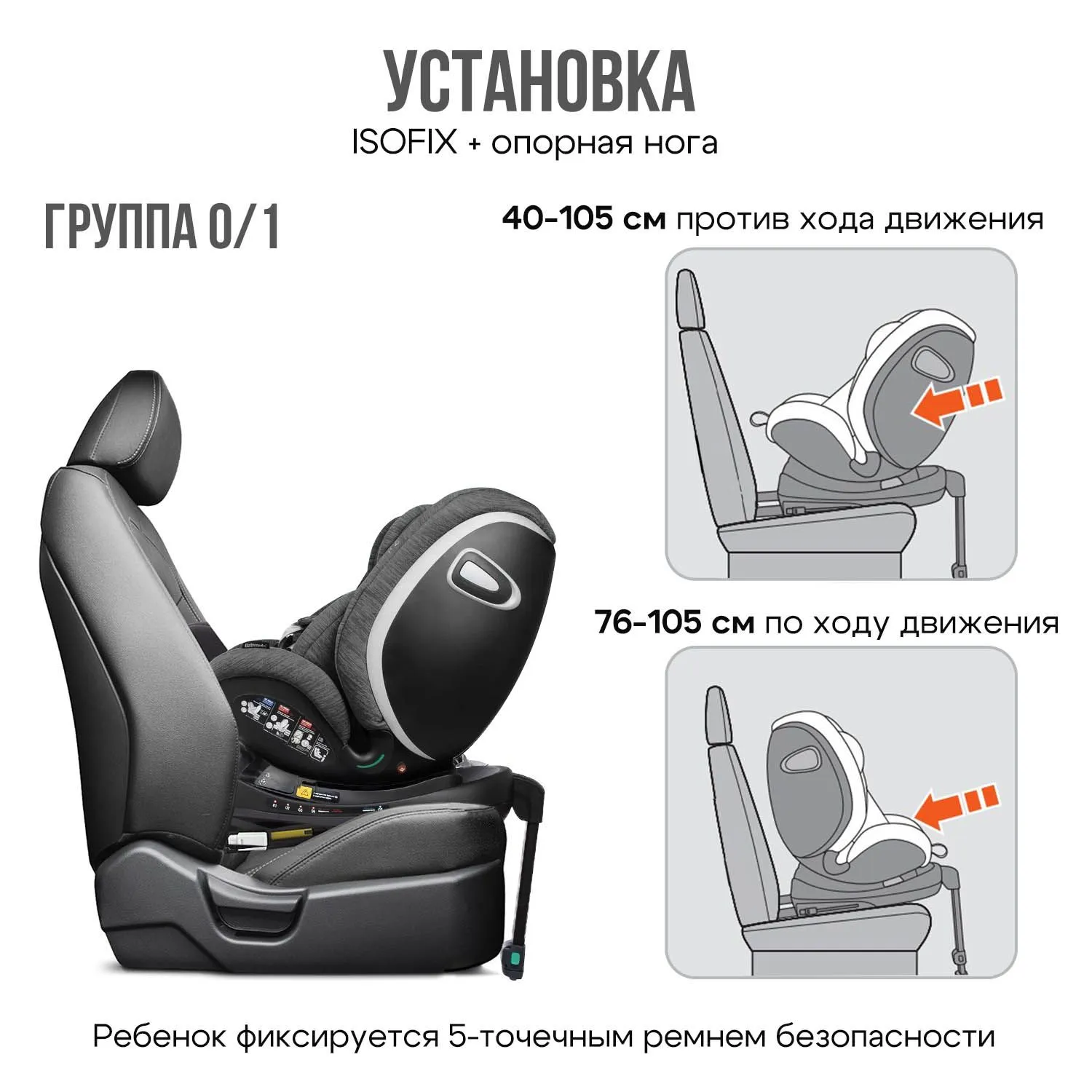 Автокресло устанавливается в автомобиль при помощи системы ISOFIX, имеет индикаторы верной установки. Для защиты от опрокидывания обязательно используйте третью точку опоры — специальную опорную ногу. Если в вашем автомобиле нет креплений ISOFIX, используйте штатный ремень в сочетании с опорной ногой. В группе 2-3, от роста 105 см опорная нога не требуется.