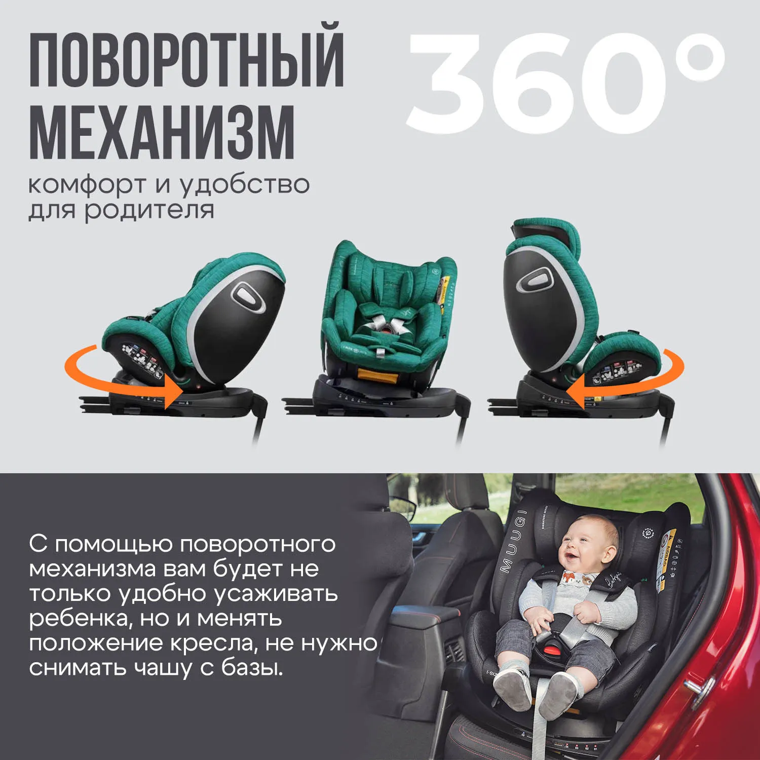 - Поворотный механизм 360°: комфорт и удобство для родителя
