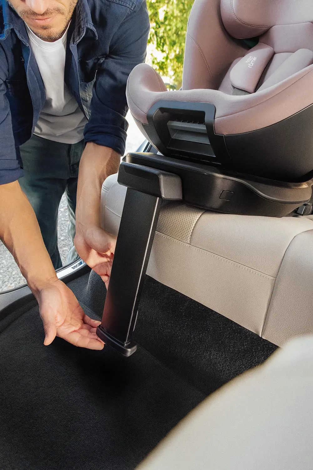 Надёжная установка автокресла SWIVEL с помощью регулируемой опорной ноги. Нога фиксируется в пол автомобиля, обеспечивая дополнительную устойчивость и сводя к минимуму перекос и смещение автокресла. За счёт специального индикатора легко понять, когда опорная нога плотно прижата к полу салона автомобиля, что облегчает правильную установку.