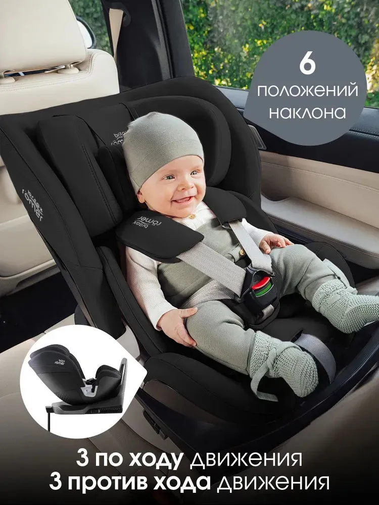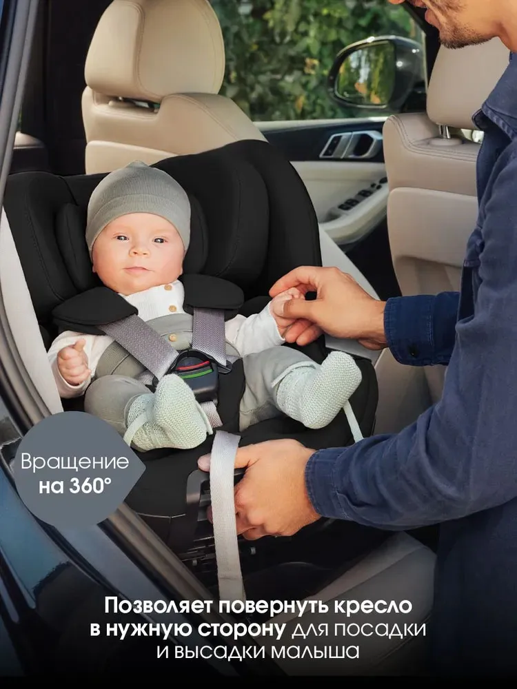 Независимо от того, путешествует ли ваш ребенок лицом по направлению движения или лицом против направления движения, в наклонном или вертикальном положении, вращение SWIVEL на 360° позволяет быстро посадить и высадить ребенка из автомобиля. Вы будете готовы к поездке за считанные секунды!