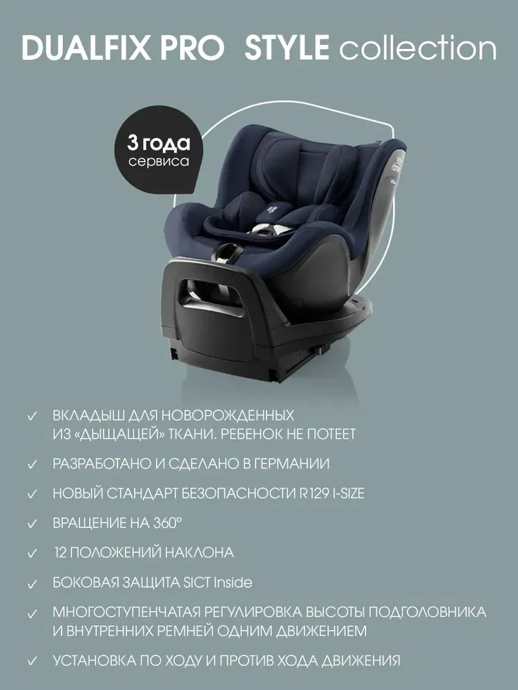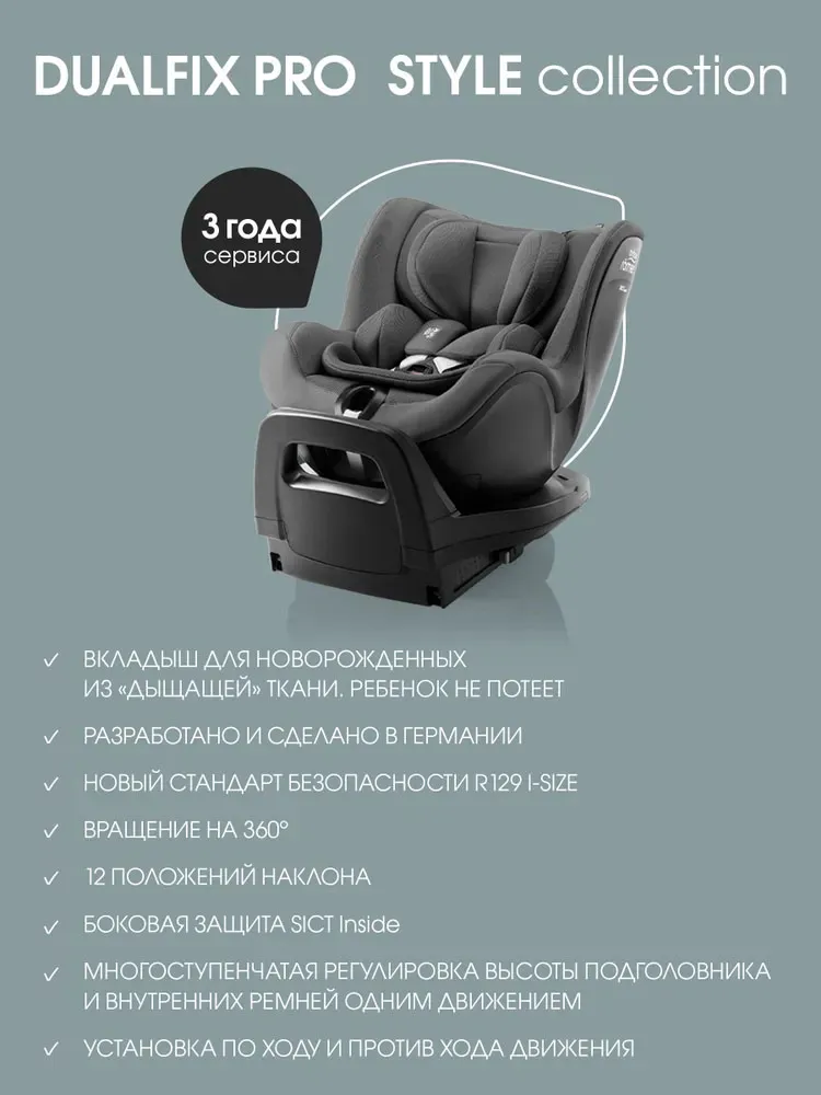 Автокресло DUALFIX PRO – это уверенность в том, что ваш ребёнок будет в безопасности во время любой поездки. Подходит для детей от рождения до 4-х лет (105 см), может устанавливаться как по ходу, так и против хода движения. А благодаря вращению чаши на 360 ° вам будет легко выполнить посадку и высадку вашего малыша – даже на самой тесной парковке.