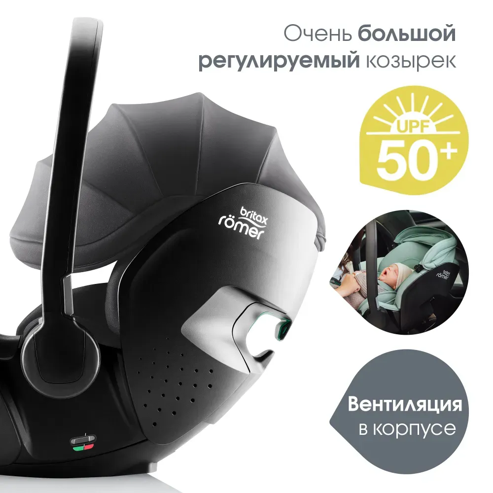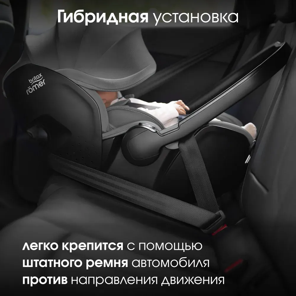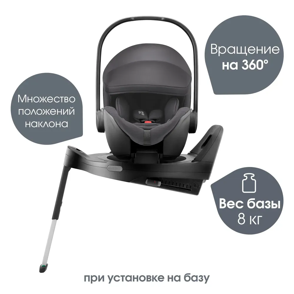 Устанавливается штатным ремнем или на поворотную базу Britax Roemer, а также совместима с большинством прогулочных колясок.