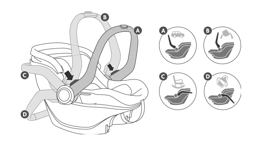 - Положение A. Дорожное. Когда автокресло находится в транспортном средстве, ручка для переноски ДОЛЖНА быть до упора переведена вперед, чтобы обеспечивать максимальную защиту в случае аварии.