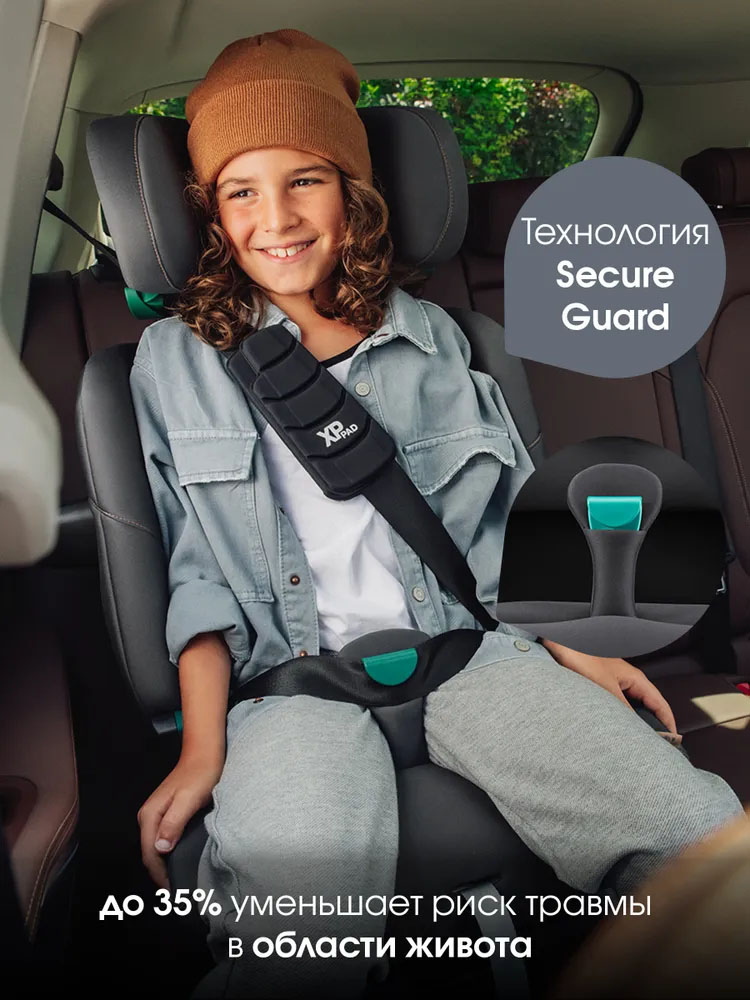 SecureGuard помогает защитить уязвимую область живота вашего ребенка с помощью дополнительной четвертой точки крепления в 3-точечном ремне безопасности. Она удерживает поясной ремень в оптимальном положении (по тазовыми костям) и способствует снижению давления на область живота при лобовом столкновении до 35 %*, при этом движения ребенка во время поездки не скованы.