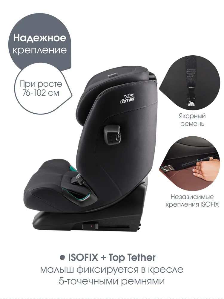 Advansafix Pro можно легко отрегулировать, и оно будет расти вместе с ребенком. Когда рост вашего ребенка достигнет 100 см или максимум 105 см, а вес 22 кг, необходимо перейти от фиксации встроенным 5-точечным ремнём безопасности на фиксацию 3-точечным штатным ремнем автомобиля. Благодаря функции FLIP&GROW это легко осуществить при помощи всего нескольких простых действий.