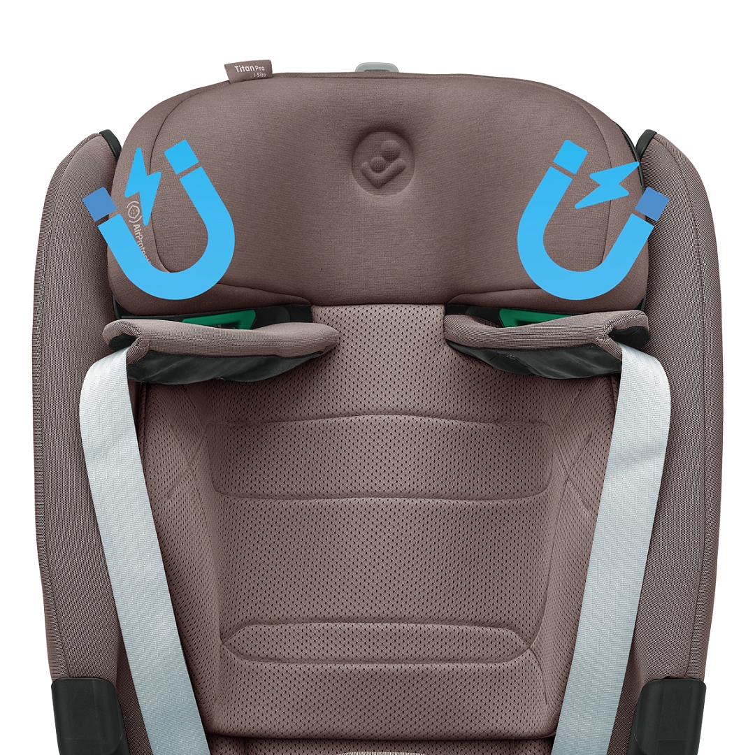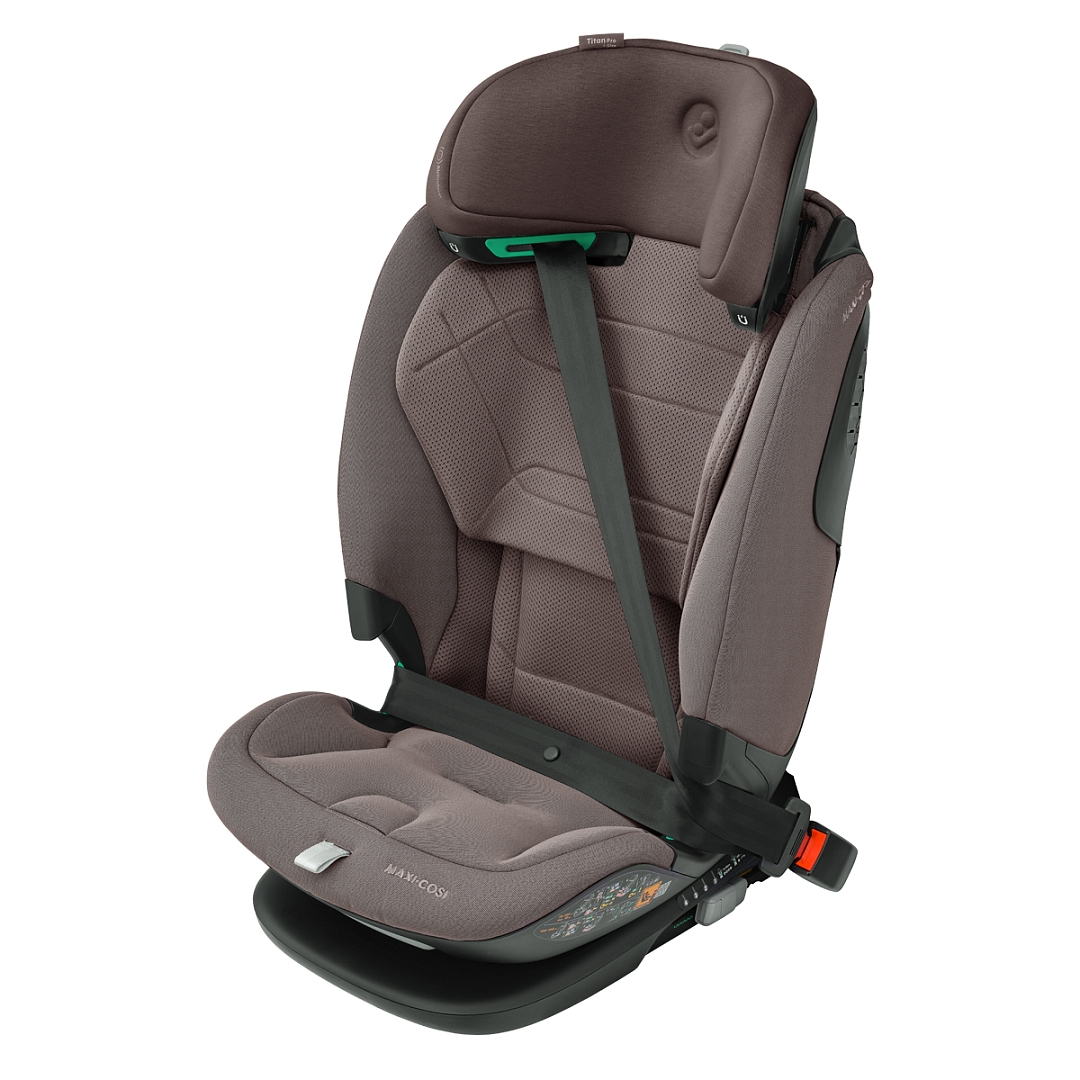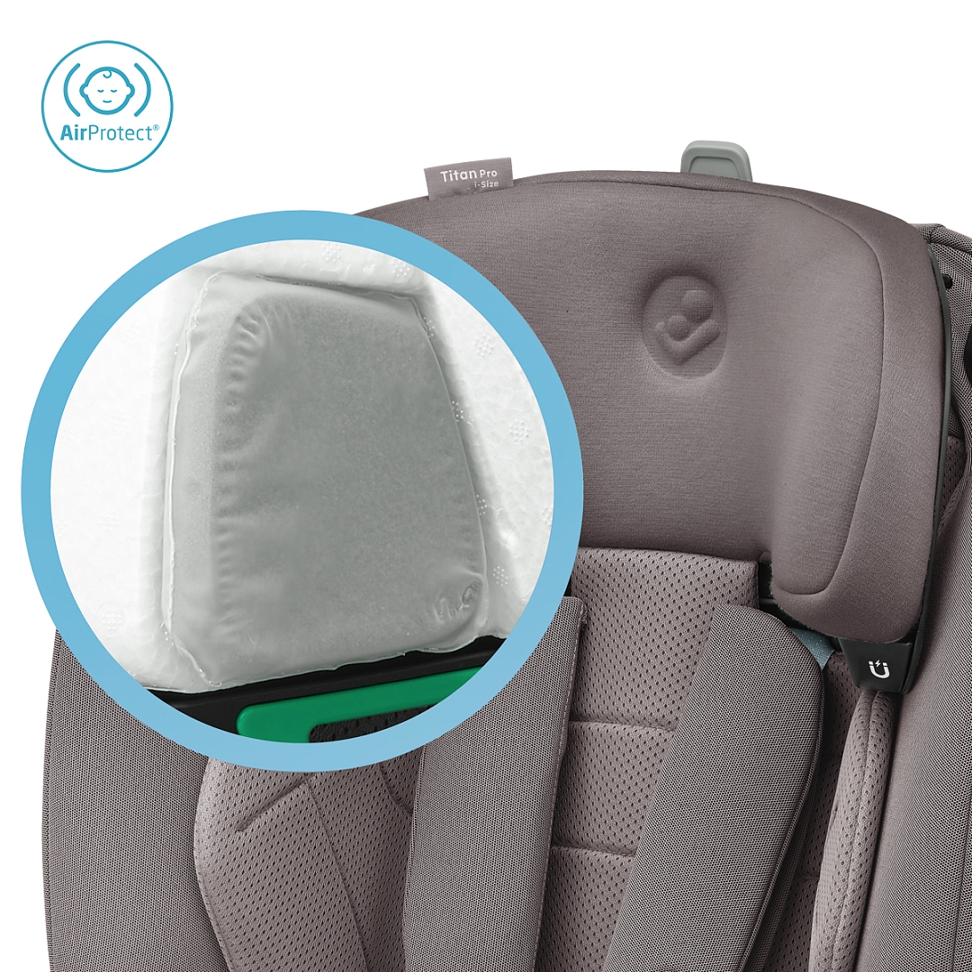 Maxi-Cosi Titan Pro i-Size оборудовано запатентованной системой боковой защиты головы AirProtect и туловища G-Cell, крепится коннекторами ISOFIX с якорным ремнем (Top Tether) и штатными ремнями безопасности при весе ребенка от 18 кг. Чехлы из «дышащих тканей» и фирменные панели ClimaFlow гарантируют высокий уровень комфорта в любую погоду.