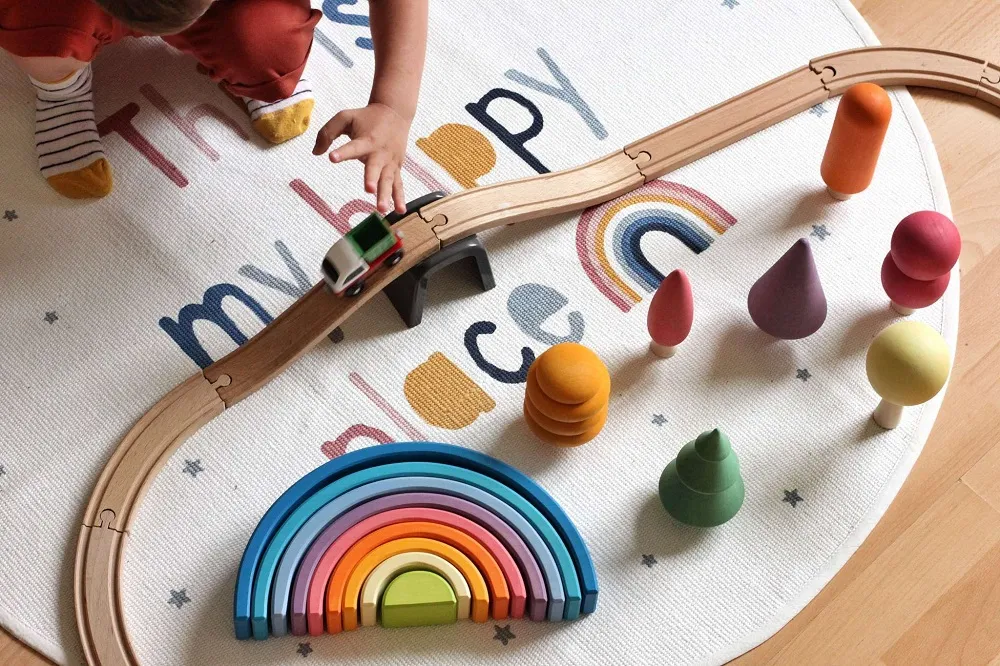 Играя с пирамидкой-радугой, ваш ребенок может изучать цвета, разобраться с понятиями «больше — меньше», «внутри — снаружи», строить интересные конструкции, гаражи для игрушечных машинок, туннели для поездов железной дороги, вольеры для игрушечных животных и многое-многое другое.