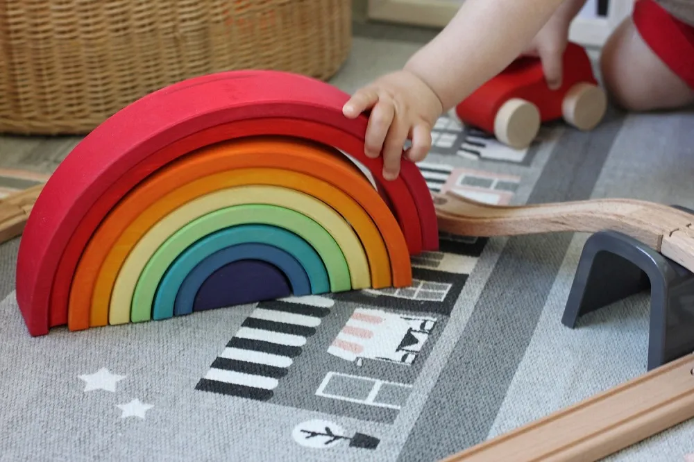 Играя с пирамидкой-радугой, ваш ребенок может изучать цвета, разобраться с понятиями «больше — меньше», «внутри — снаружи», строить интересные конструкции, гаражи для игрушечных машинок, туннели для поездов железной дороги, вольеры для игрушечных животных и многое-многое другое.