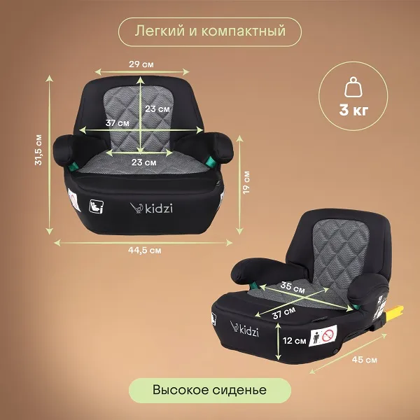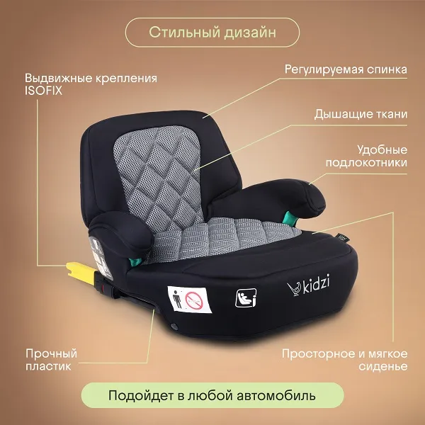 Бустер разработан с учетом эргономических требований, чтобы обеспечить правильное положение ребенка и поддержку его позвоночника. Современный дизайн делает его стильным и подходящим для любого автомобиля.