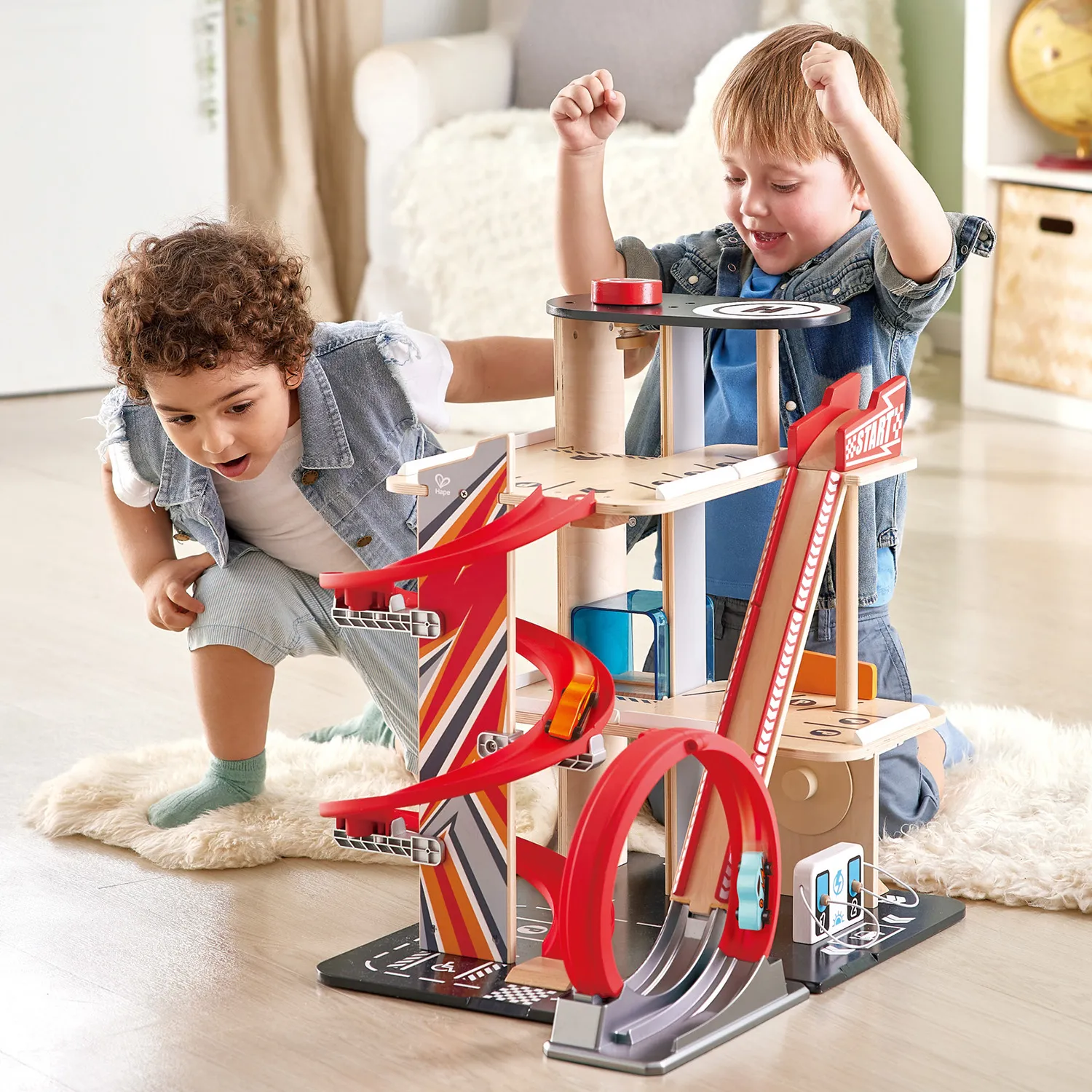 В игровом наборе от Hape есть рабочий лифт для перевозки ваших игрушечных машинок на верхние уровни парковки. Сверху это гонка вниз с фантастическими трюками на рампе. В набор входят зарядные порты для питания ваших электромобилей, поворотная ручка для выбора услуги, необходимой в сервисном центре, и два быстрых игрушечных автомобиля, с которыми можно поиграть. Поставьте свои машины на кон и отправьте их на дно с помощью одной из двух рамп для трюков!