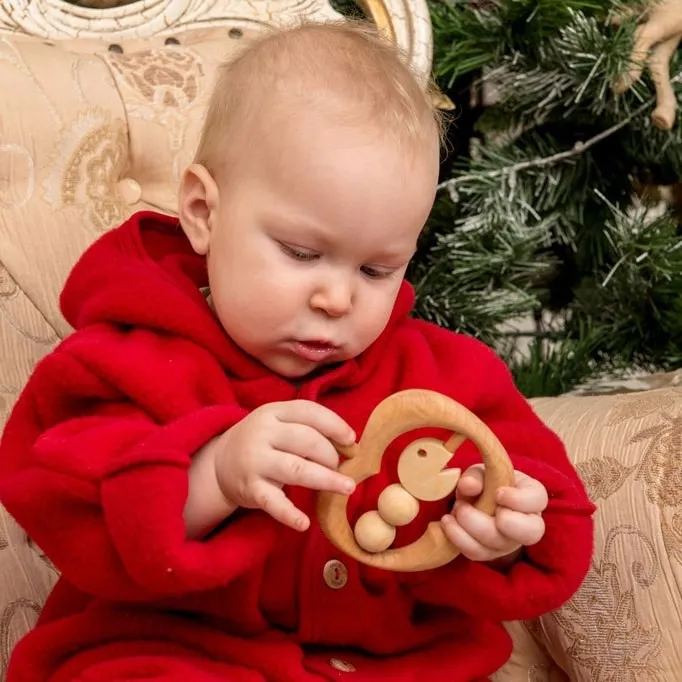 Прорезыватель также можно использовать как игрушку, которая поможет малышу развить моторику рук и тактильные ощущения. А если потрясти игрушку, то ваш малыш услышит негромкий стук. Погремушка-грызунок выполнена в виде гусеницы, которая уже прогрызла в кленовом яблоке две большие дырки и нетерпеливо ползает туда-сюда, широко разевая голодный ротик. Грызунок можно подвешивать на перекладину в кроватке, на дугу игрового коврика или использовать в шнуровке. В возрасте от 5 месяцев вы можете положить игрушку чуть дальше от малыша, чтобы он попытался до нее дотянуться, лежа на животике — мотивация к первым попыткам ползания.