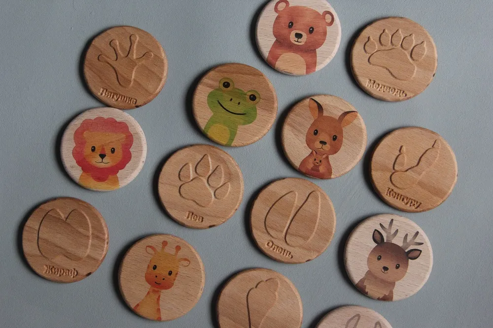 LisKids спешит познакомить вашего ребенка с самыми интересными животными с помощью набора деревянных фишек «Чьи следы»!