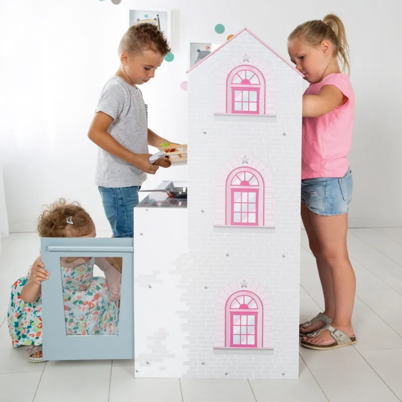 Практичный игровой домик 2в1 от Roba с одной стороны оснащен красивым домиком для кукол, а с другой — детской кухней. Детская кухонная зона оборудована холодильником, раковиной, краном, микроволновой печью, конфорками, плитой с вращающимися ручками и грилем.
