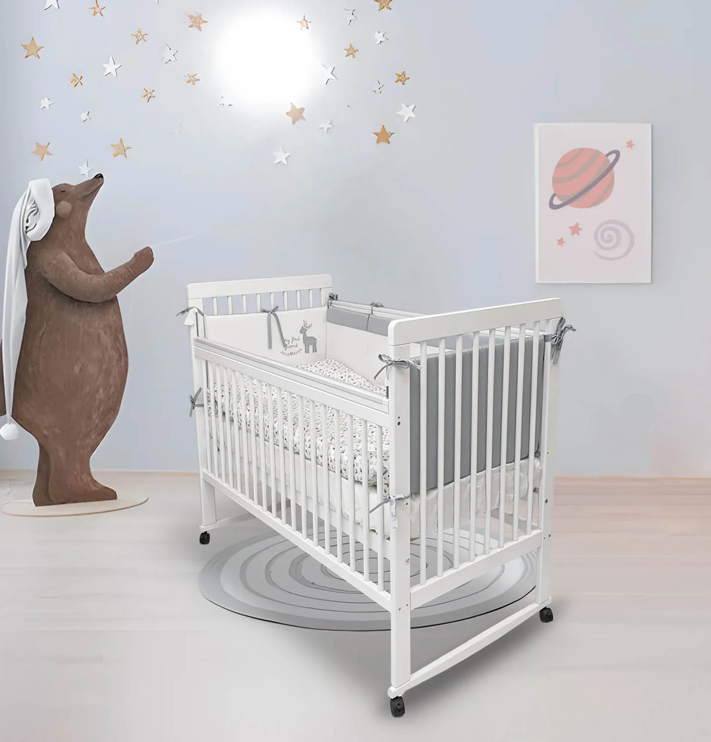 Дополните кроватку красивым комплектом постельного белья 120х60, не забудьте про матрац и наматрасник (приобретаются отдельно).