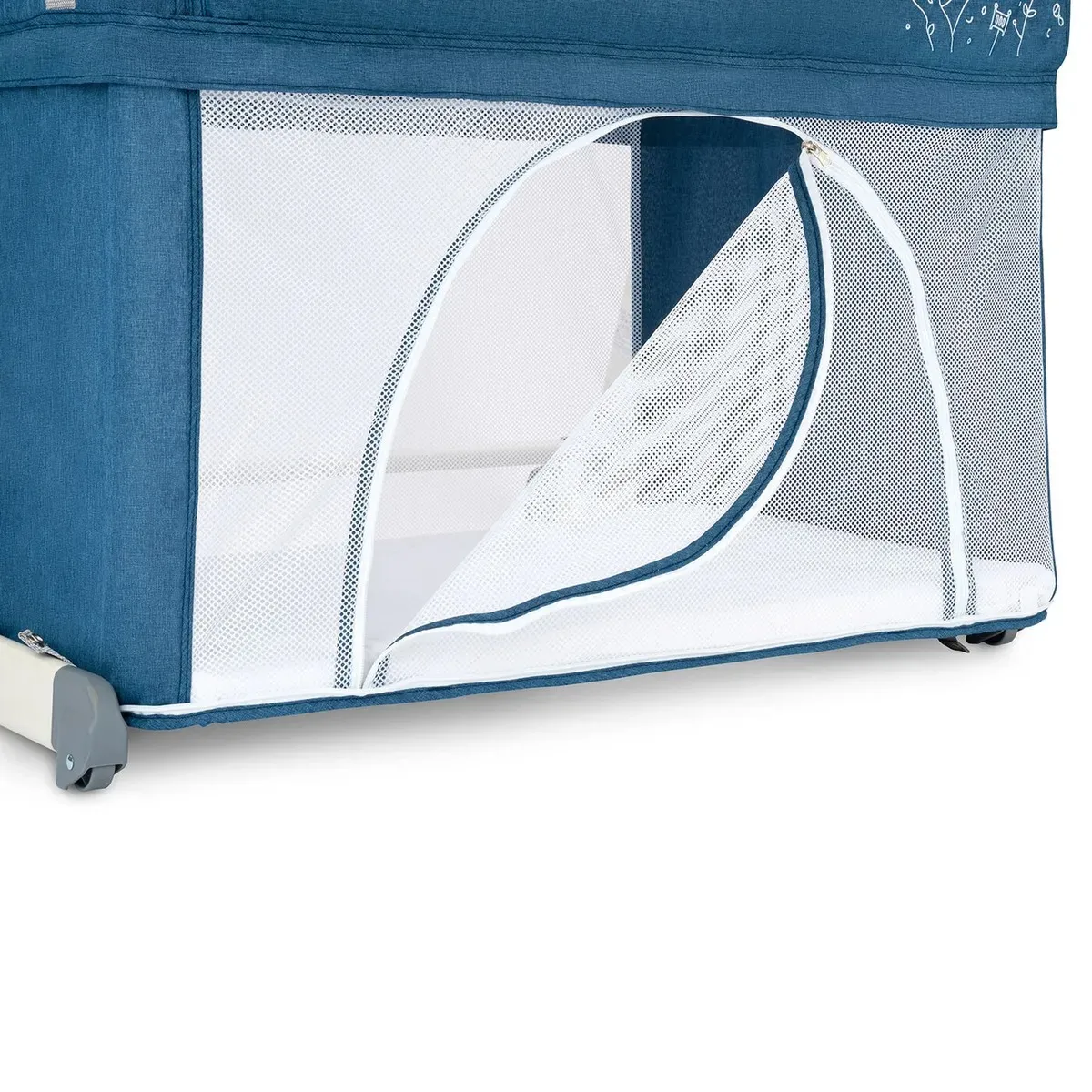Отличительной особенностью данной модели является возможность трансформации в манеж. Для этого необходимо расстегнуть молнии на основании корпуса, после чего опустить каркас до уровня пола. Матрасик, предлагаемый в комплекте, имеет съемный чехол, который можно стирать в ручном режиме.
