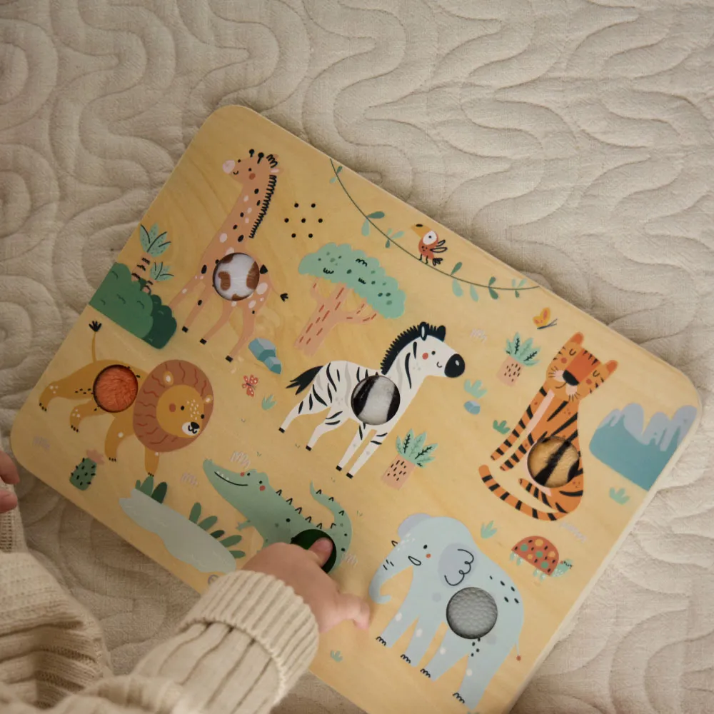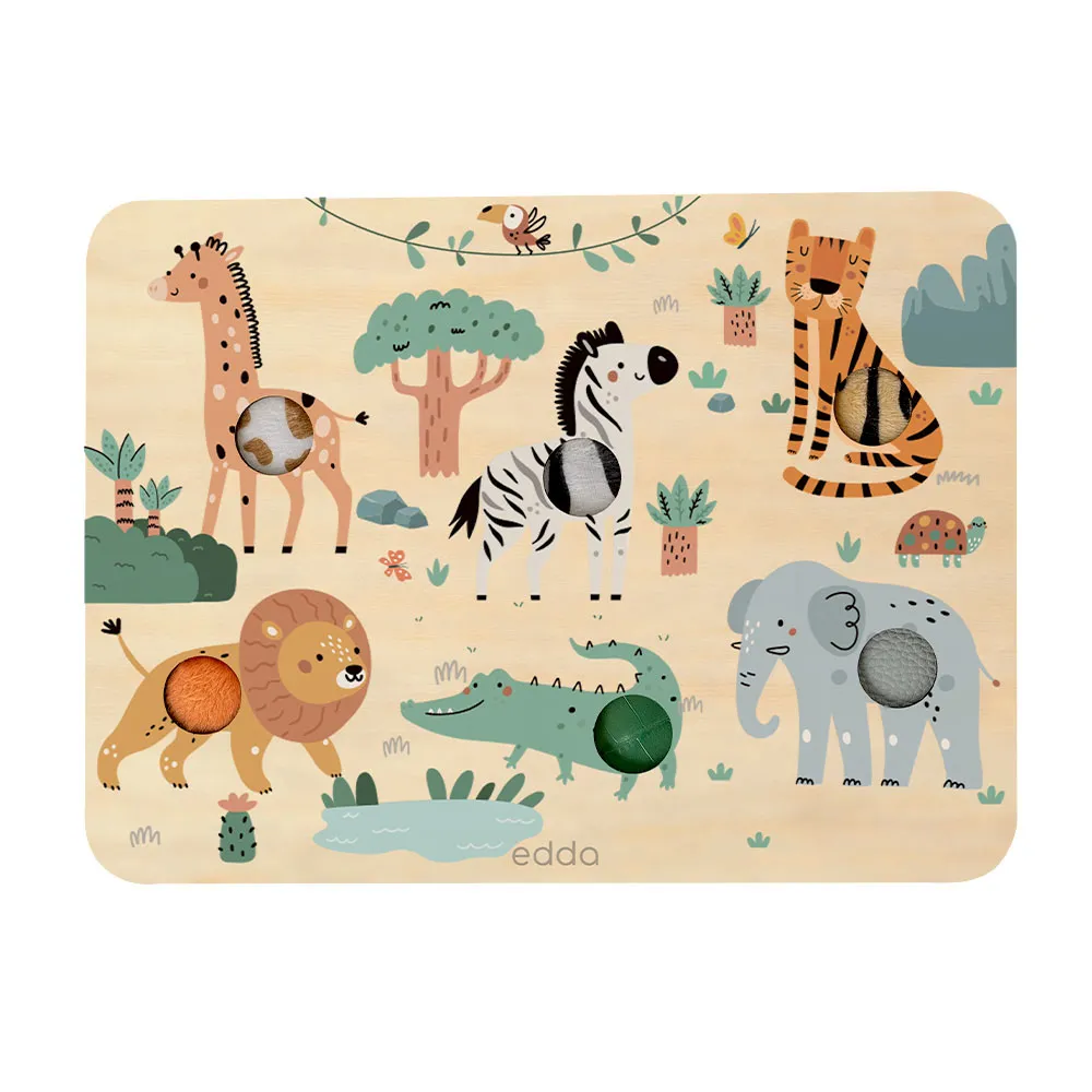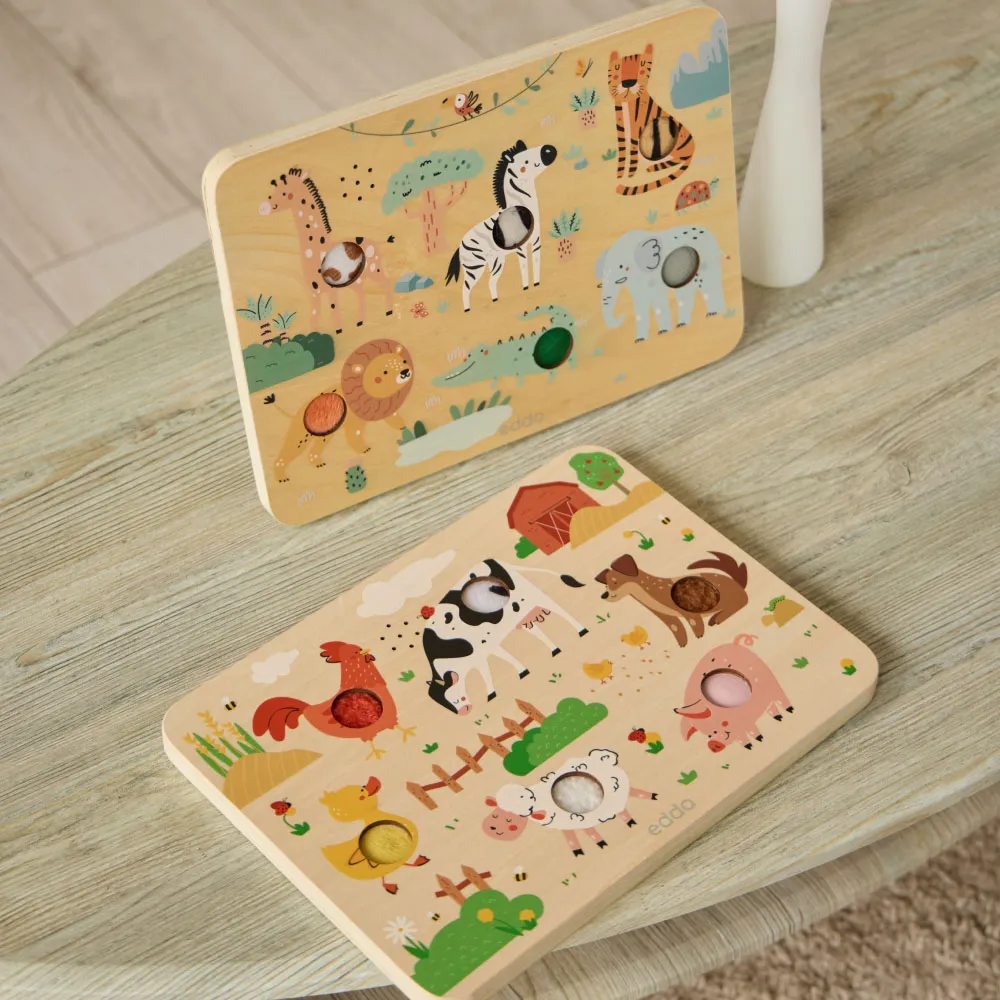 Уникальные развивающие тактильно-звуковые доски edda: при нажатии кнопки на доске воспроизводятся реалистичные звуки животных, а сами кнопки имеют тактильные вставки-текстуры. Такие игры способствуют мультисенсорному развитию ребёнка и позволяют увлечь малыша надолго – как в самостоятельной игре, так и в игре-обучении с близкими. Для разнообразных игровых сценариев доступно два варианта дизайна: «Сафари» и «Ферма».