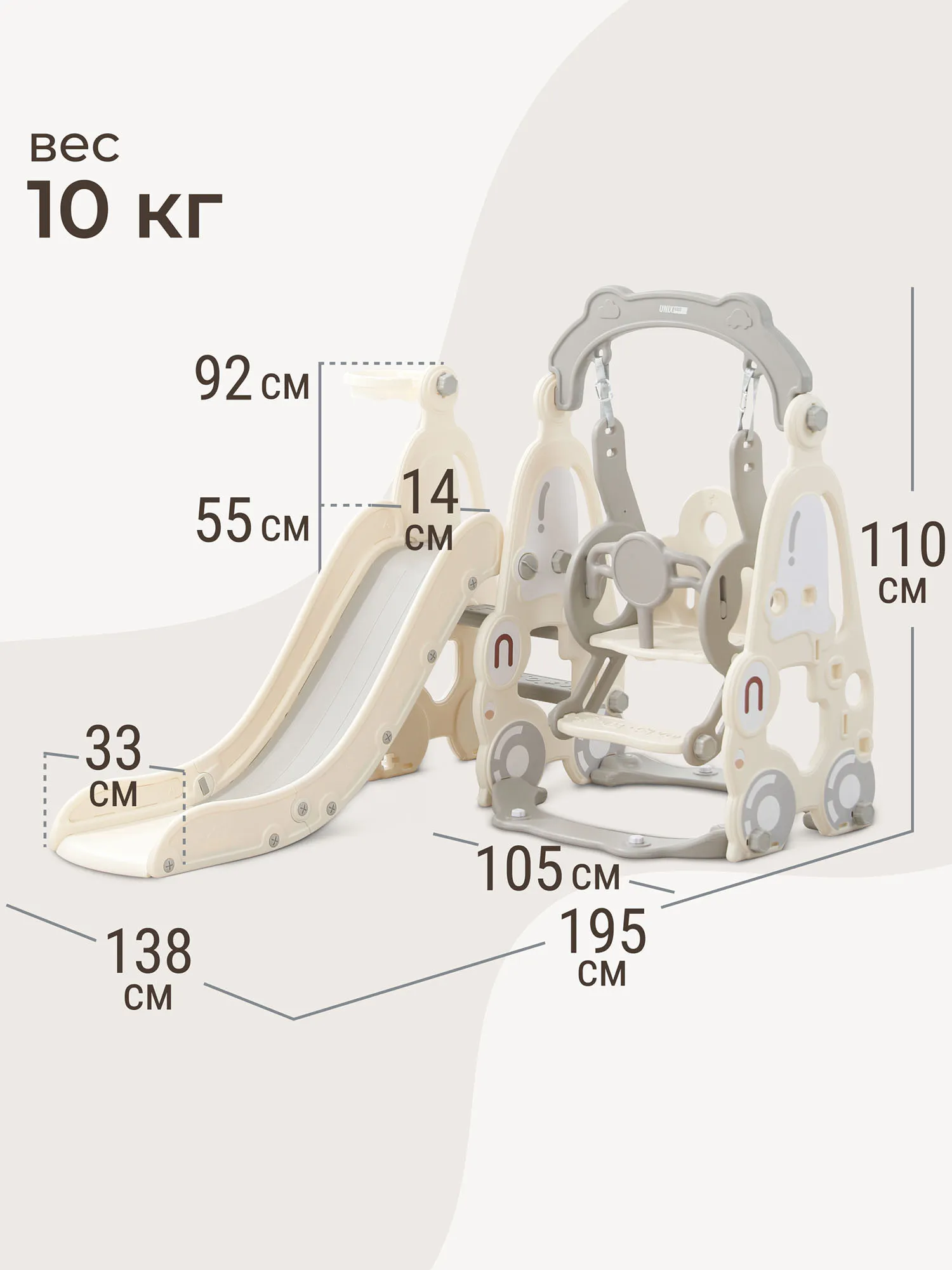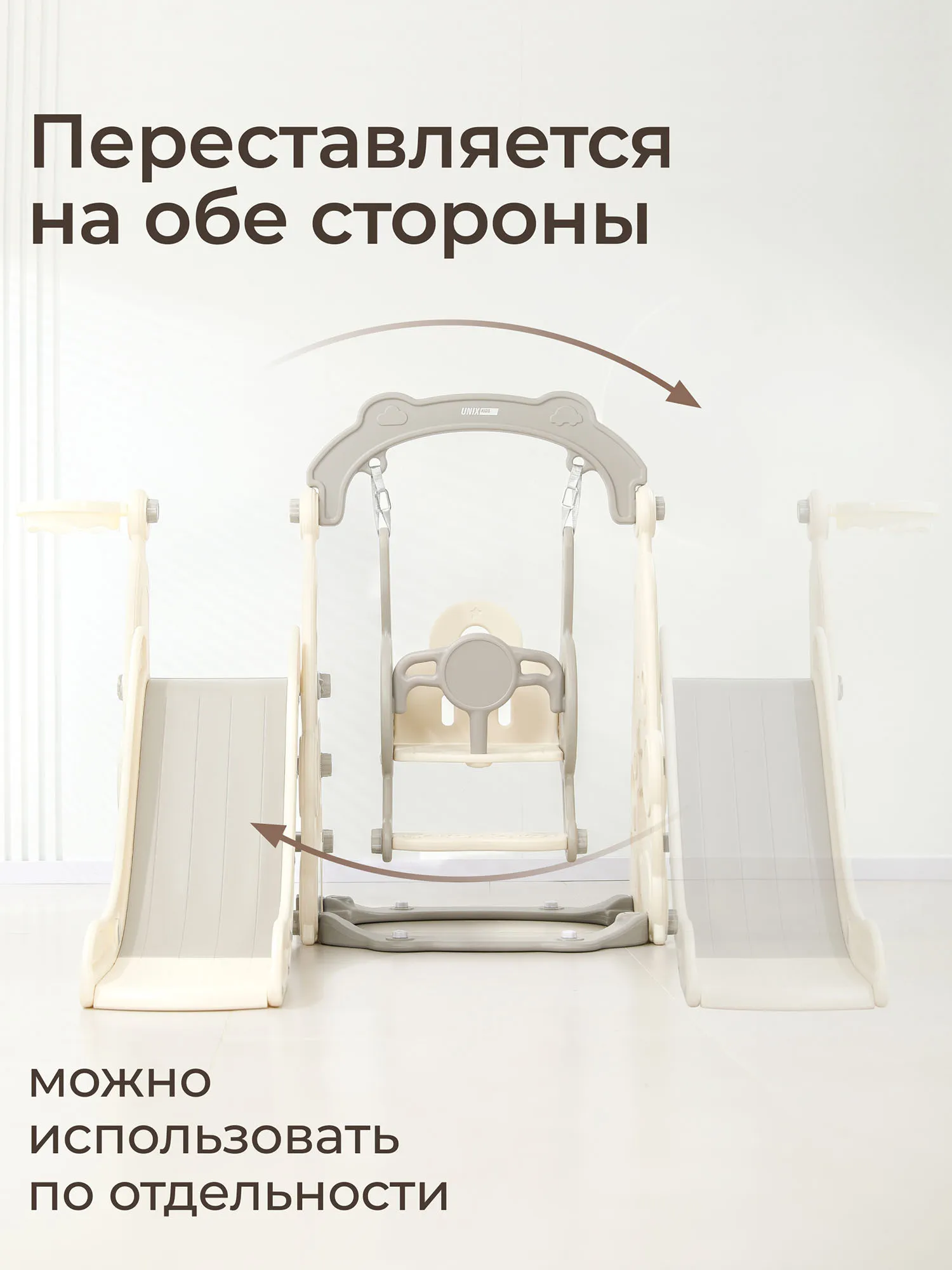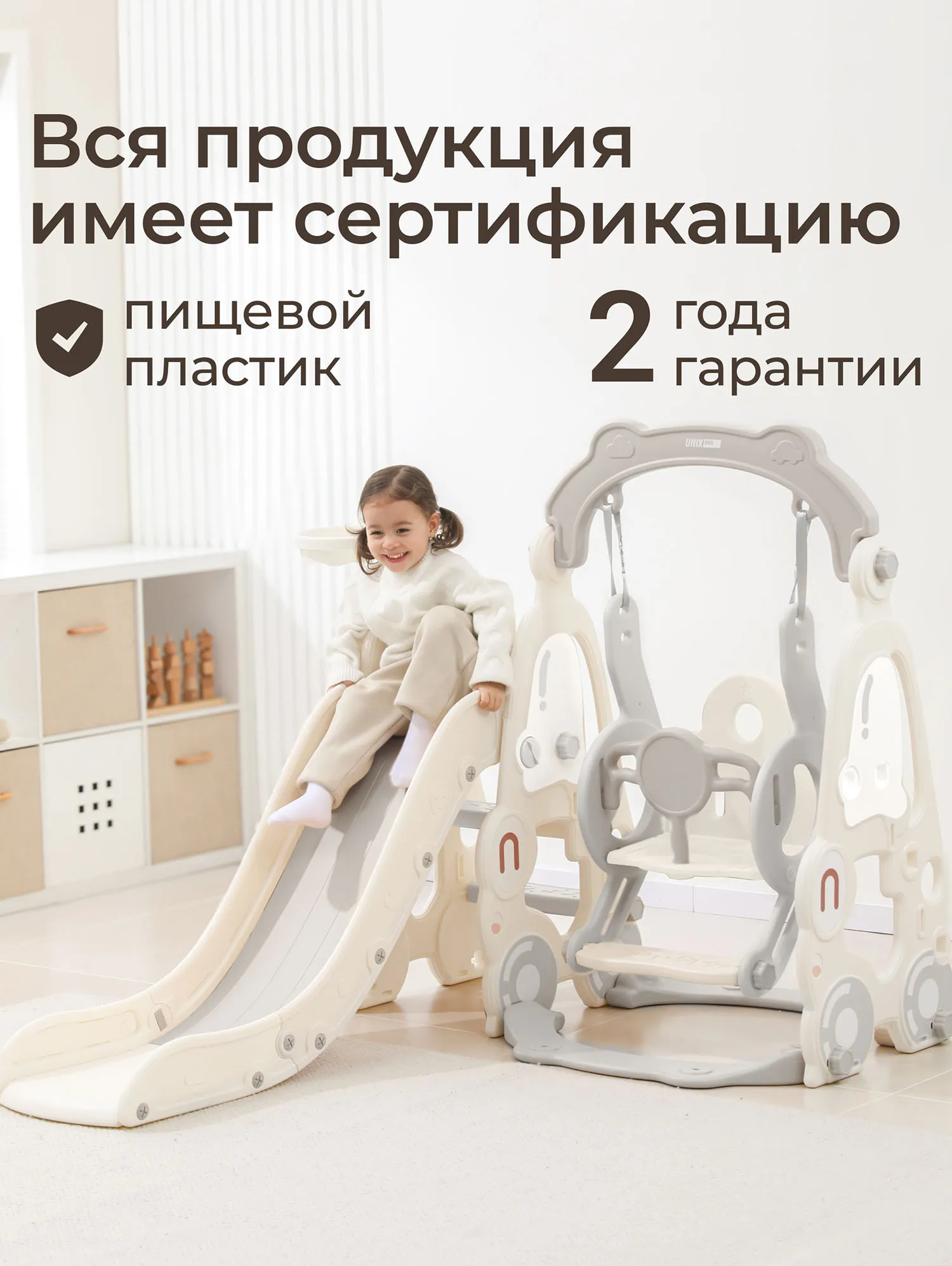 Как и все манежи Unix Kids, горка с качелями изготовлена из пищевого пластика 4-го класса — согласно классификации ГОСТ, гипоаллергенного и абсолютно безвредного даже для самых маленьких пользователей. Этот материал не боится UV-лучей, можно использовать на улице.
