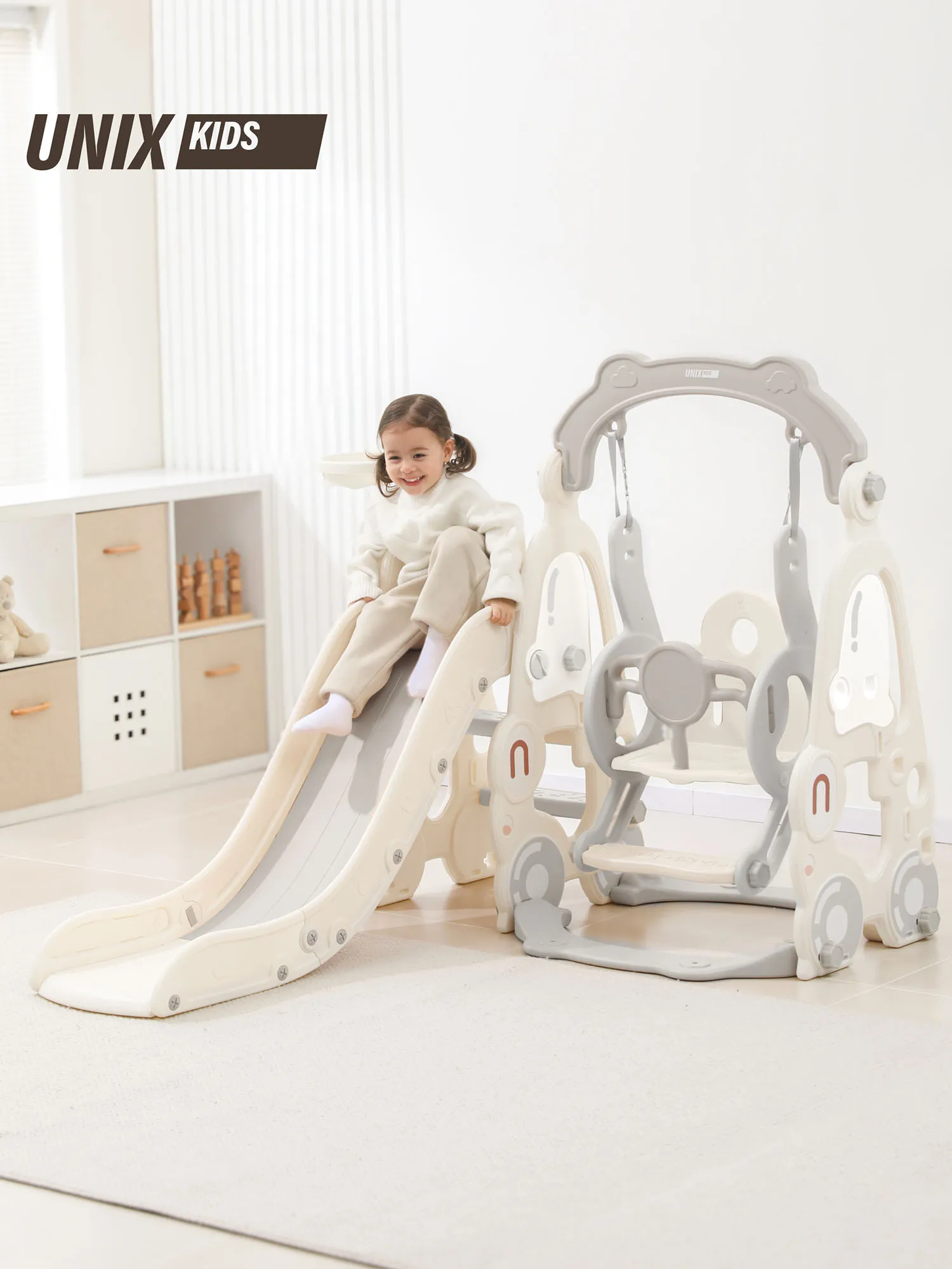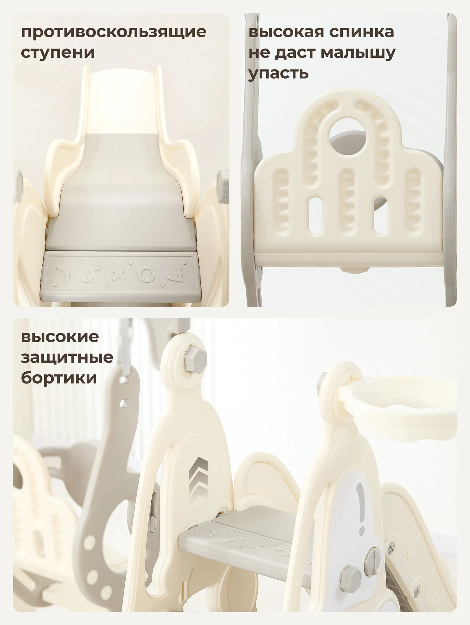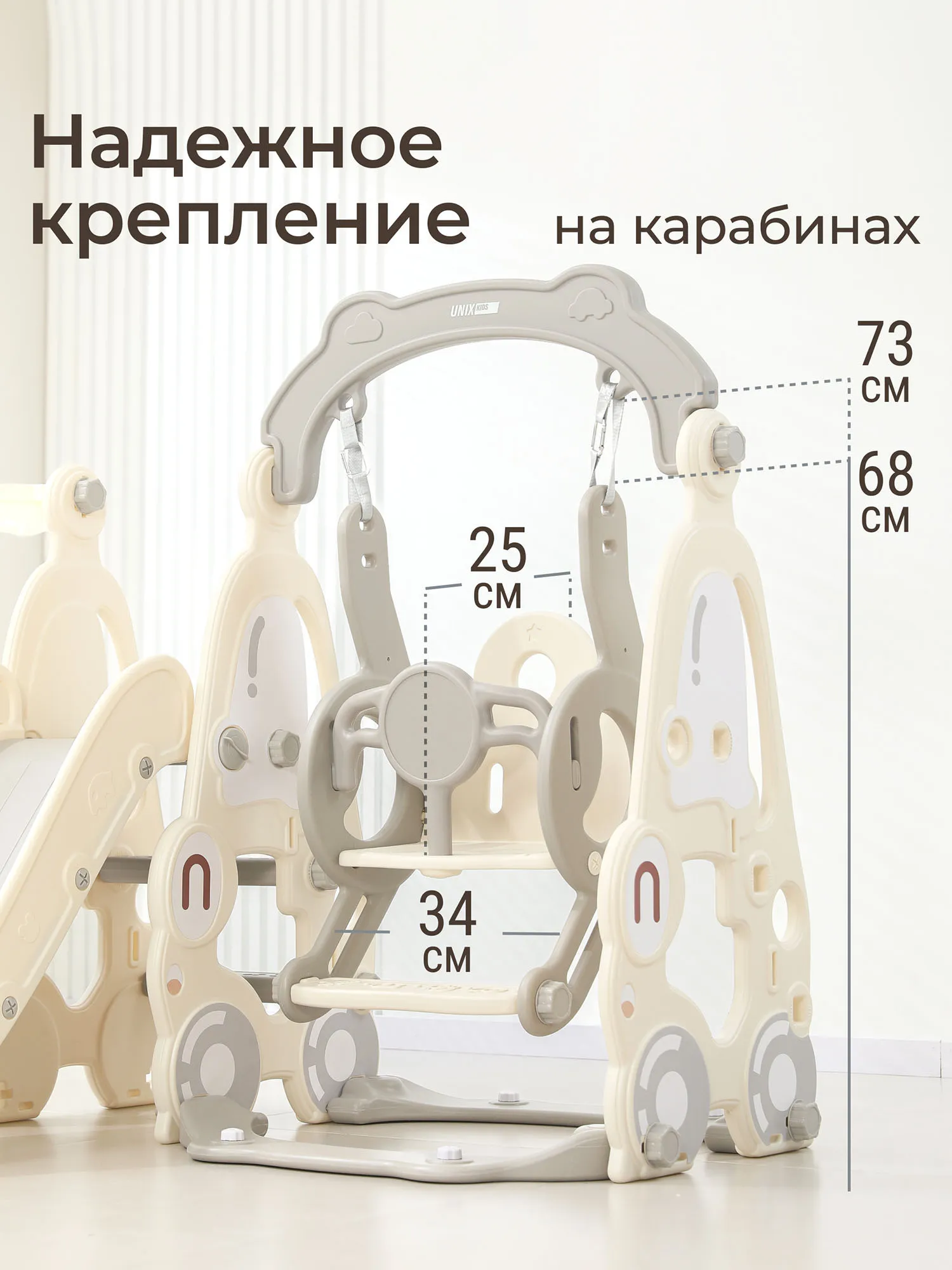 Как и все манежи Unix Kids, горка с качелями изготовлена из пищевого пластика 4-го класса — согласно классификации ГОСТ, гипоаллергенного и абсолютно безвредного даже для самых маленьких пользователей. Этот материал не боится UV-лучей, можно использовать на улице.