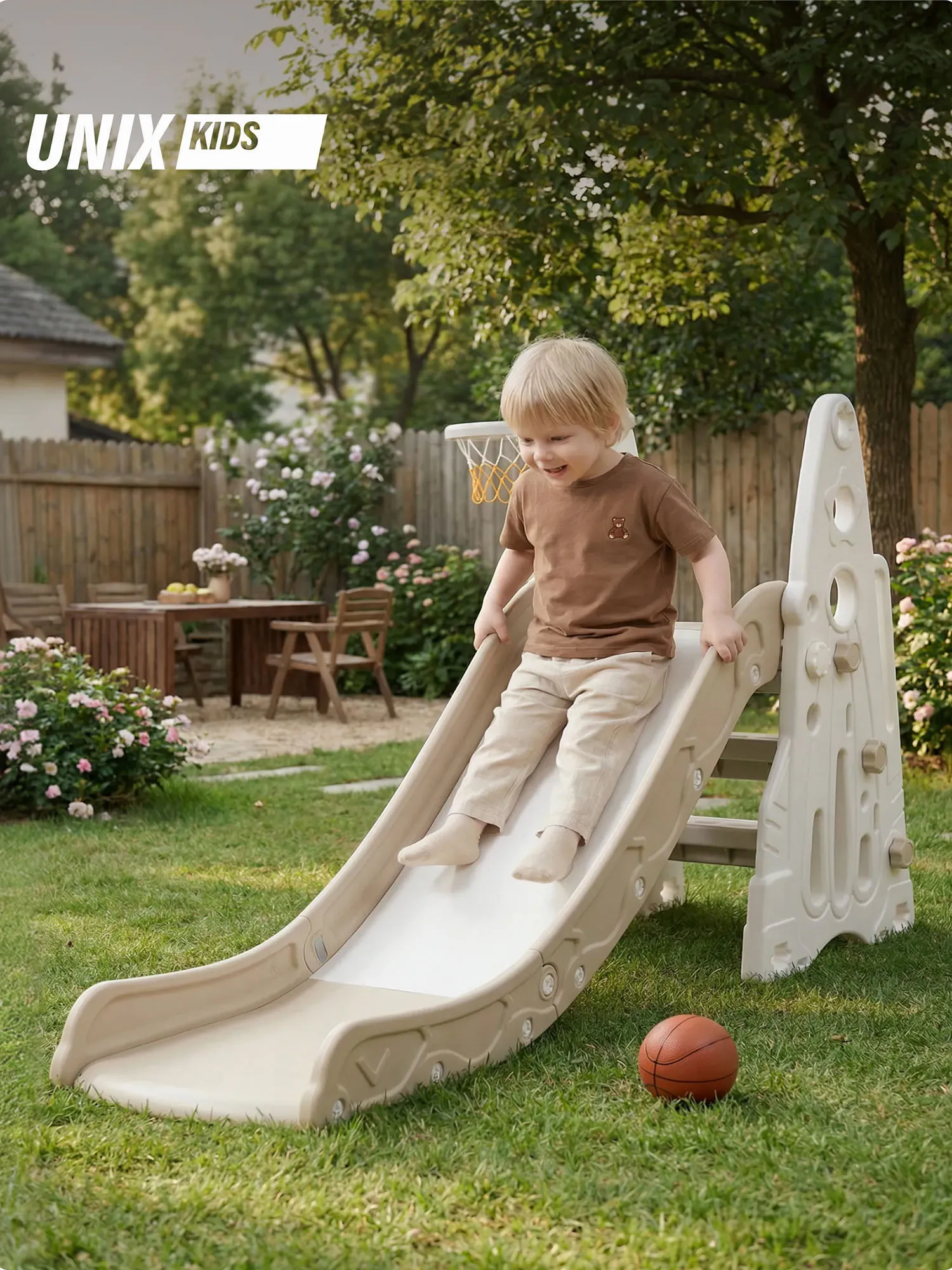 Детская горка для дома и улицы UNIX Kids Rocket (145 см) Grey с баскетбольным кольцом подарит любому ребенку увлекательное пространство для активных игр и занятий спортом дома или на даче. Представьте себе детскую площадку мечты: компактная, удобная и абсолютно безопасная!