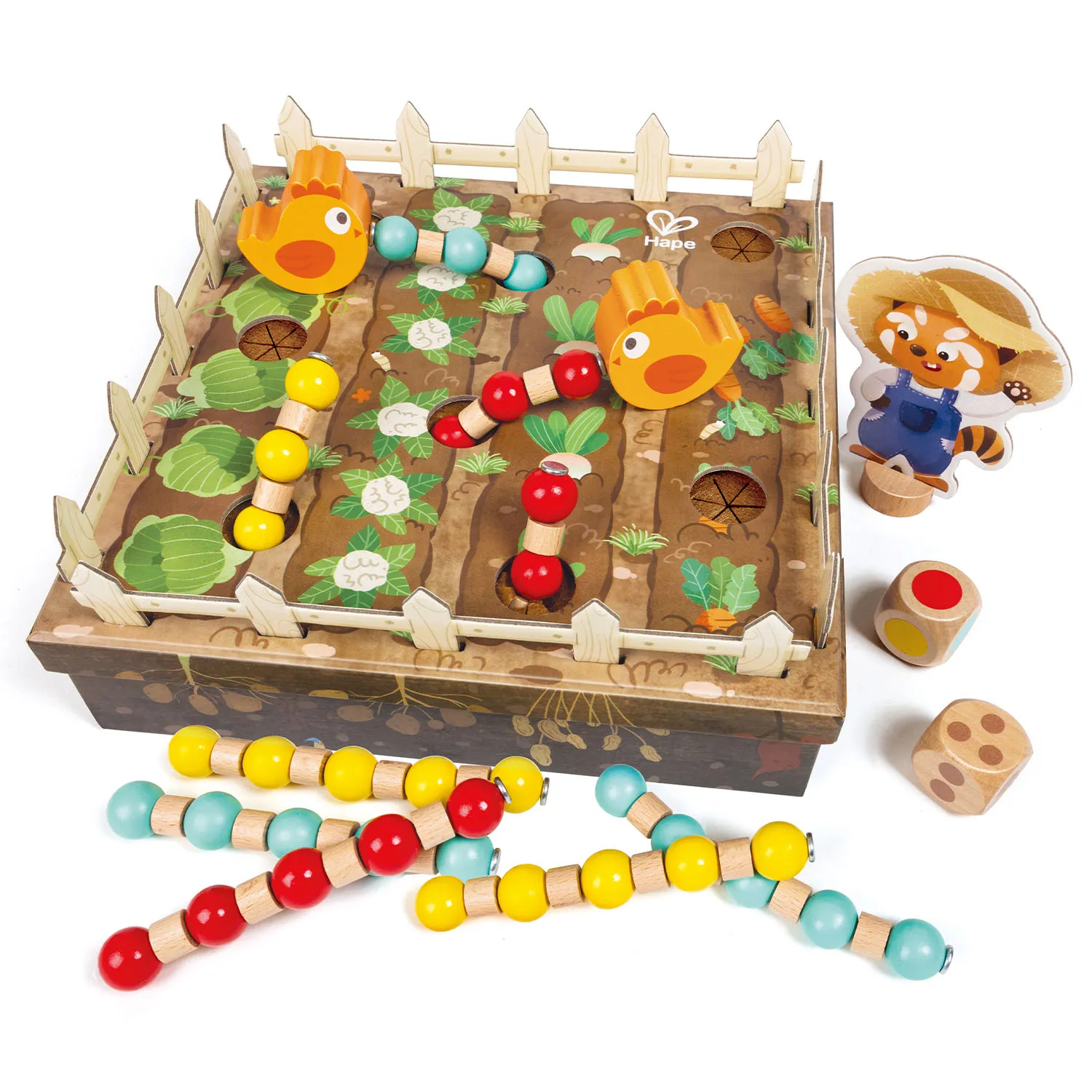 2 деревянных фигурки курицы, 9 гусениц, 2 игральных кубика, лист с фигурками, подставка для фигурок, коробка для игр, 4 ограждения.