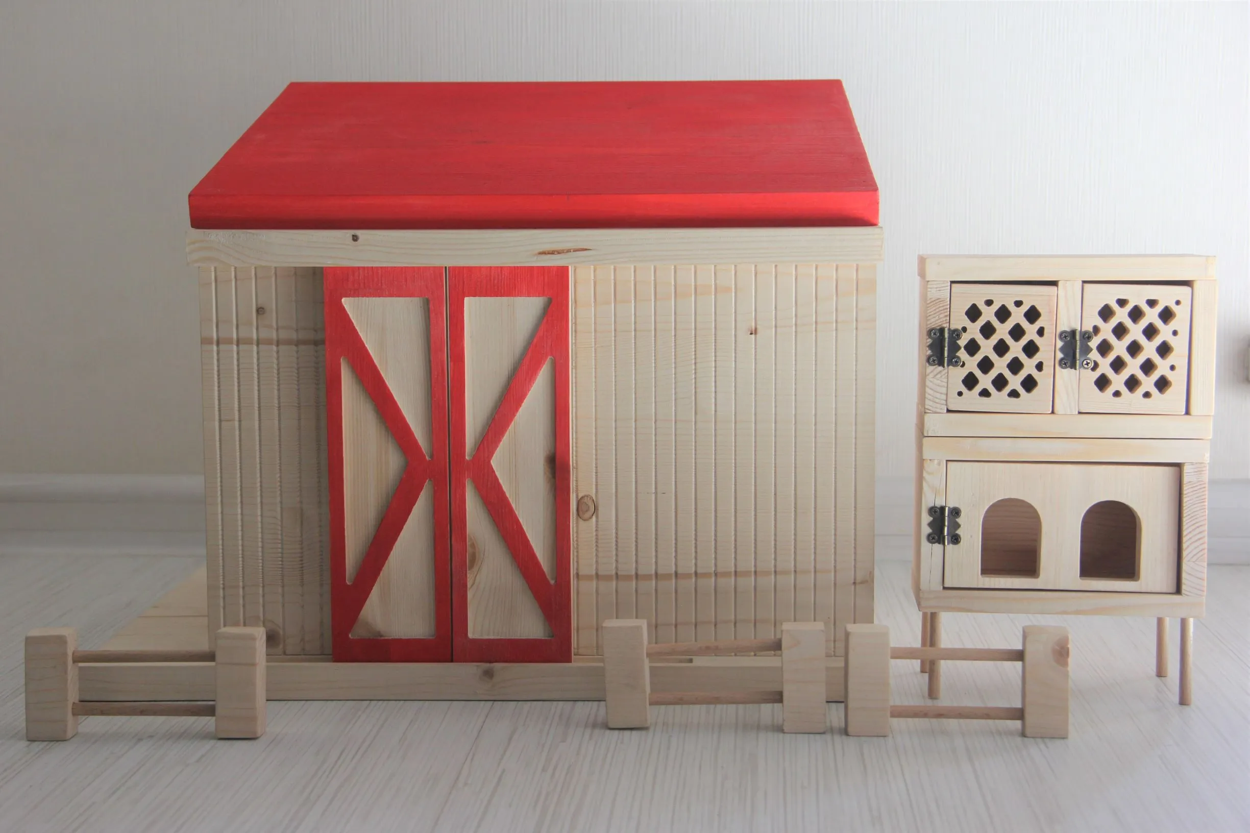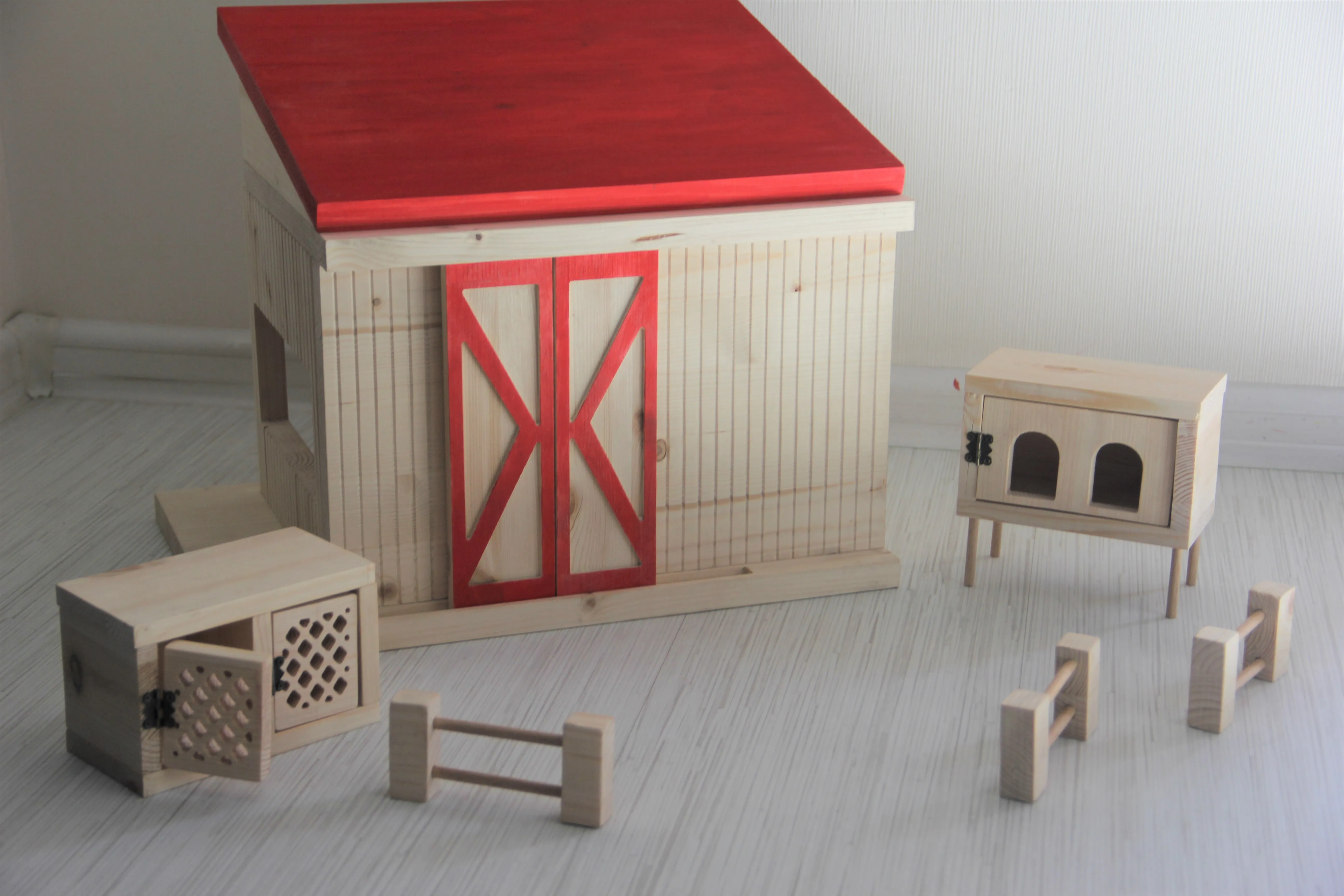 В комплект игрового набора «Ферма» входит: здание с конюшней и сеновалом, клетка для кроликов, курятник, три заборчика. Все элементы открываются и передвигаются, а также небольшие части набора можно компактно хранить внутри основного здания.