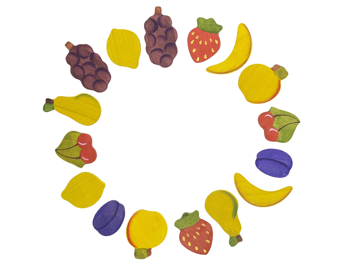 Деревянные фигурки окрашены вручную безопасными для детей красками и хранятся в удобном льняном мешочке. Фрукты можно использовать как дидактический материал для знакомства с их названиями и свойствами. Фигурки также могут служить счетным материалом. Игрушка сертифицирована для детей с 3 лет.