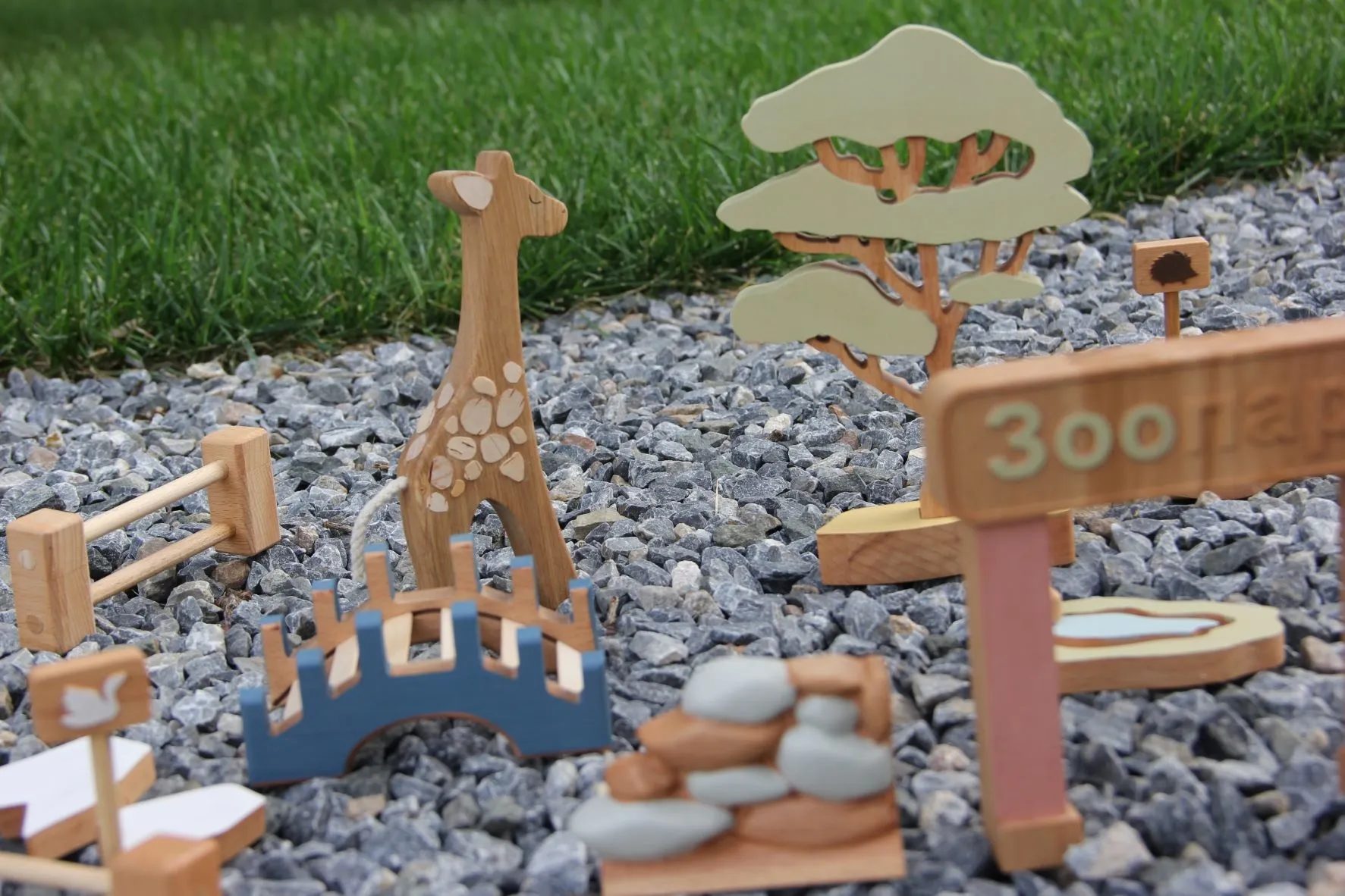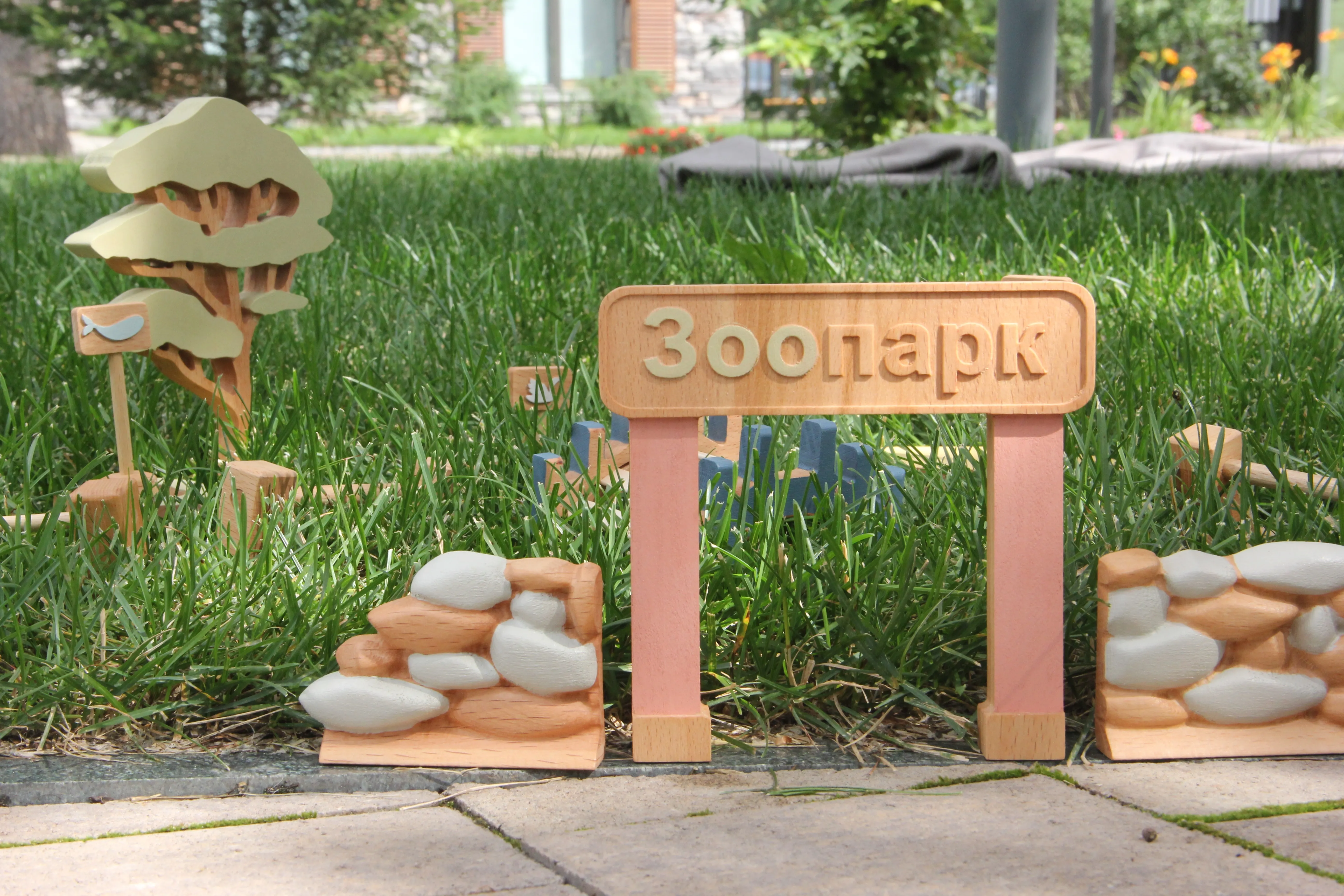 В комплект сюжетного набора «Зоопарк» входят два каменных ограждения, входная арка с гравировкой, мостик, дерево Баобаб, три забора, четыре указателя, семь элементов благоустройства (лужайка, озеро, ледники). С помощью этих элементов ребёнок сможет обустроить свой собственный зоопарк, который выглядит как настоящий!