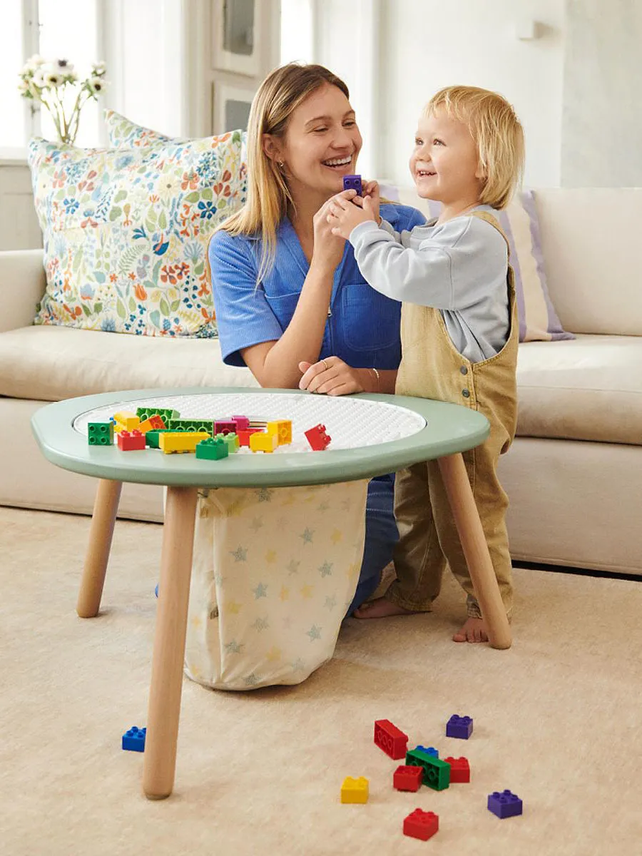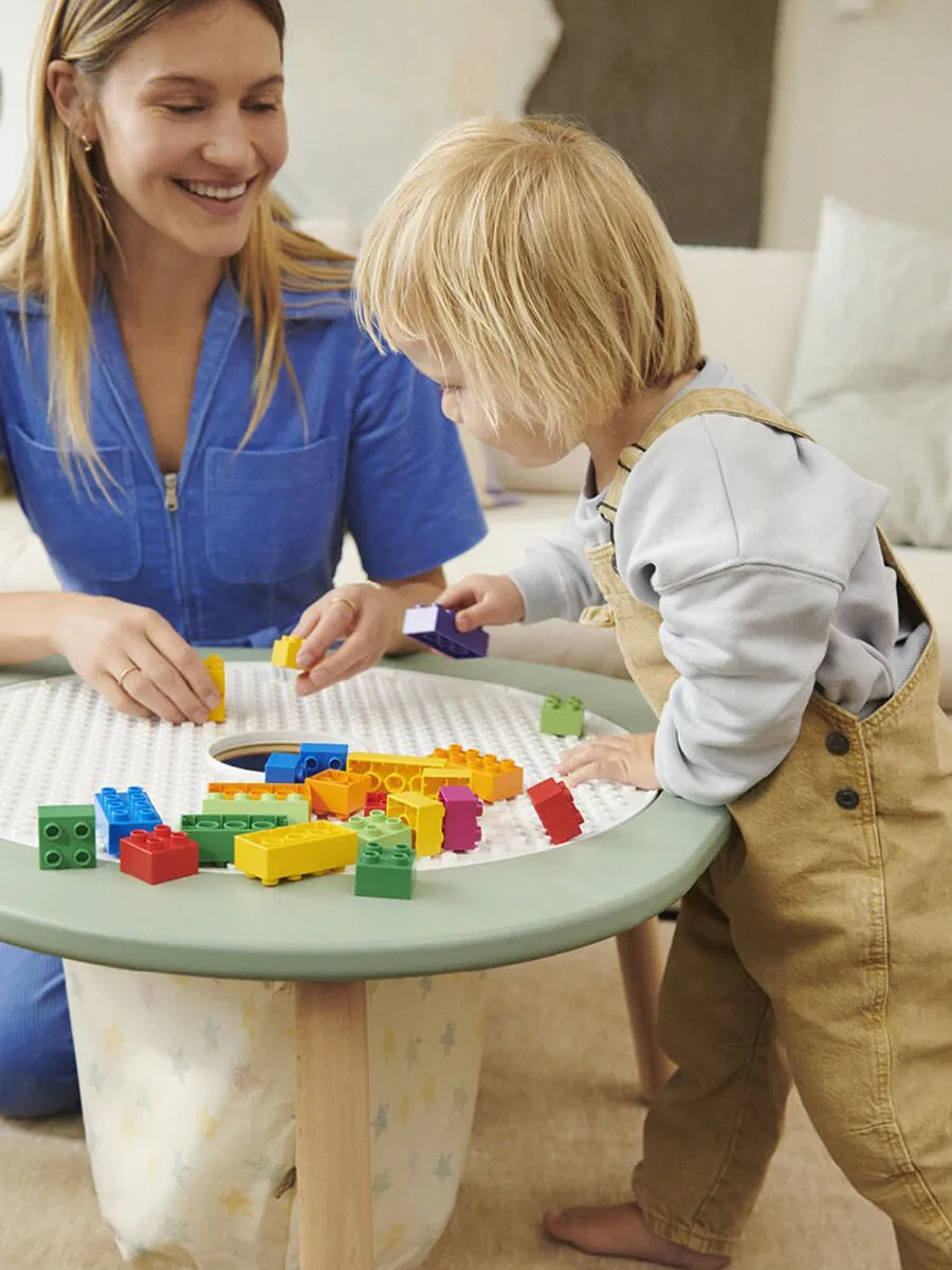 Игровой столик также служит строительной площадкой. Одна сторона основания подходит для создания крупных построек из больших кубиков. Другая же сторона рассчитана на мелкие кубики и элементы конструктора.