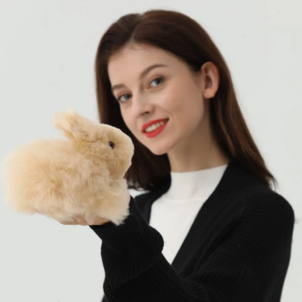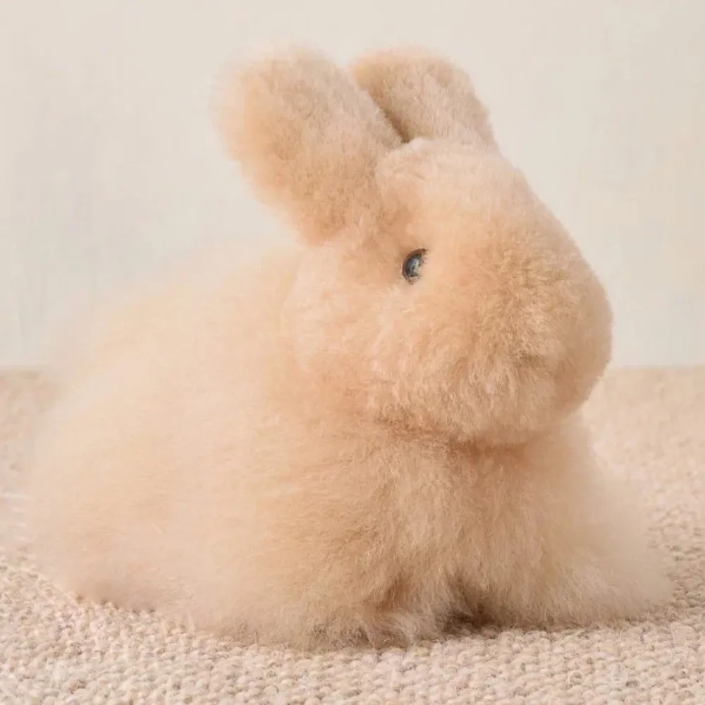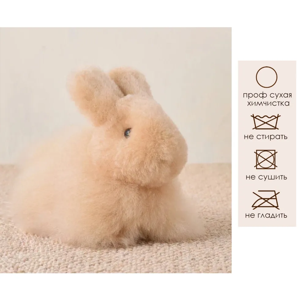 Этот очаровательный крольчонок удивительно мягкий и пушистый: он сделан вручную из 100 % меха альпаки породы уакайа талантливыми ремесленниками из Перу. Его тёплый бежевый оттенок и выразительные глазки создают ощущение уюта и радости.