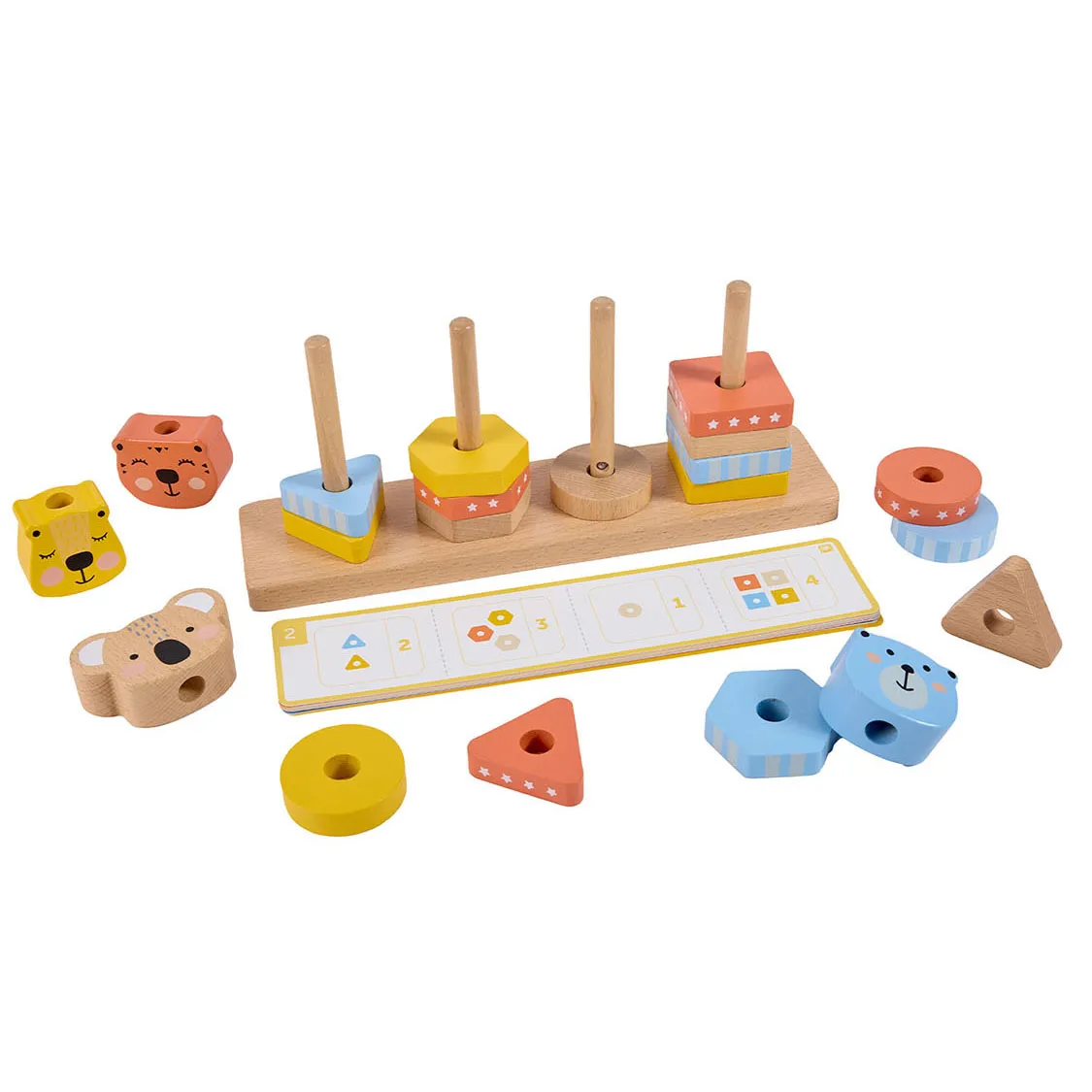 - Содержит деревянную основу с четырьмя штырьками и 16 разноцветных блоков, и 4 блока в виде животных (коала, жираф, мишка и котик);
