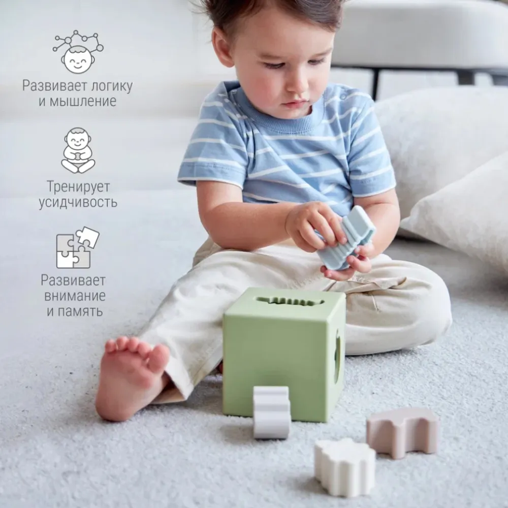 Сортер безопасен для самых маленьких: он изготовлен из гипоаллергенного пищевого силикона, его края и уголки – сглаженные и мягкие. Нежные оттенки игрушек гармонично впишутся в интерьер любой детской комнаты.