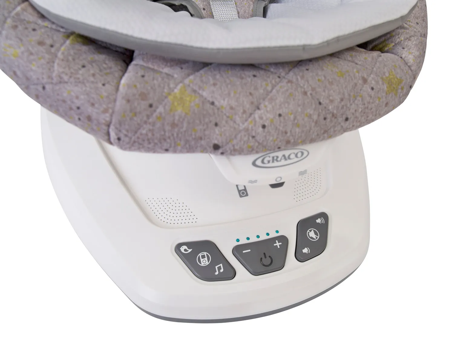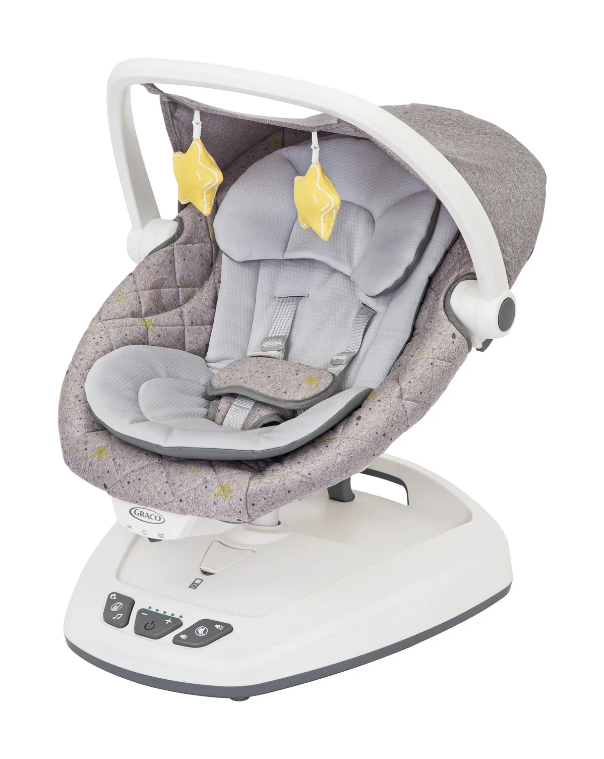 Электронные качели Graco Move With Me имеют виброрежим, возможность подключения MP3-плеера, встроенный набор из 10 мелодий и 5 звуков природы, под которые ребенку будет легче расслабиться и уснуть, а также встроенную ручку для удобства переноски. Съемный вкладыш допускается стирать в машинке при температуре +30°C.