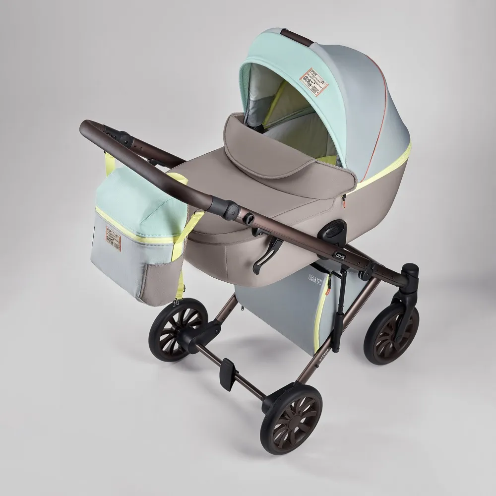 Люлька для новорожденных имеет ровное пластиковое дно и мягкий матрасик, изготовленный из эластичной ткани Air Mesh, которая принимает форму положения ребенка. Внутренняя обивка из натурального хлопка легко снимается для поддержания чистоты в ложе младенца. На дне спального блока находится вентиляционная решетка, которая обеспечивает приток свежего воздуха к малышу. Она регулируется с внешней стороны.