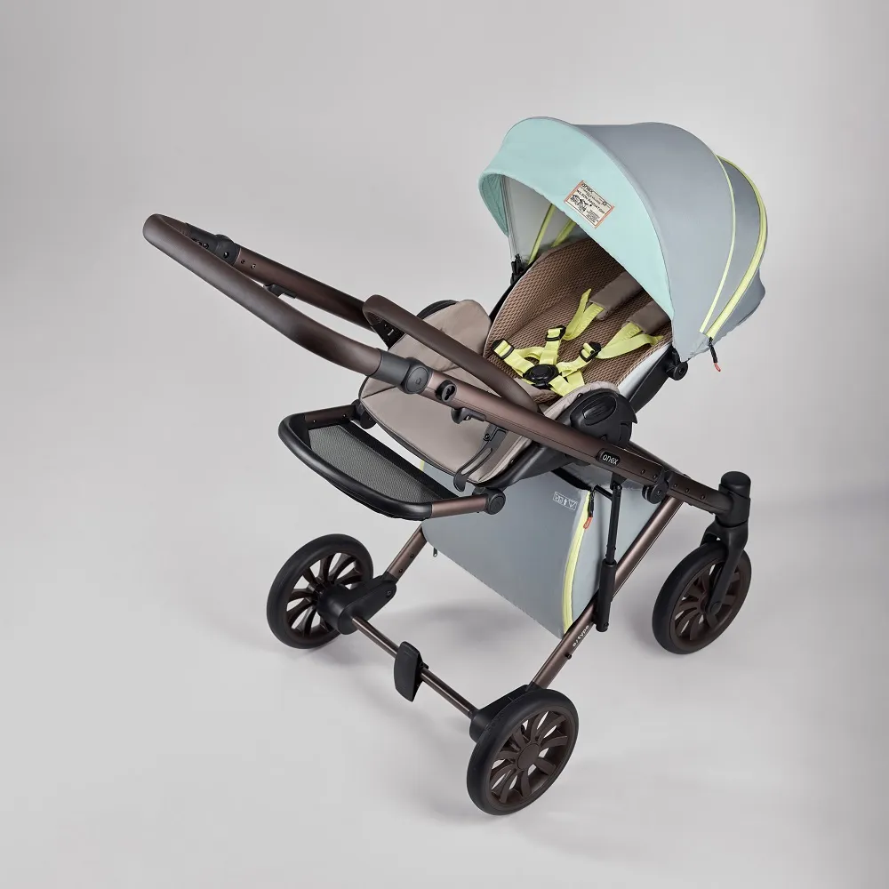 Рама с усиленной жесткостью не деформируется в процессе длительной эксплуатации. Усовершенствованная закрытая система амортизации как на передних, так и на задних колесах смягчает дорожную тряску. Обновленные колеса из полиуретана теперь с легкостью едут по любой поверхности, смягчая ход коляски. Маневренные передние колеса регулируются фиксаторами для свободного вращения или прямого движения. Новая система anti-wobble исключает колебание колес в процессе езды. Тормозная педаль с системой Comfy Stop расположена между задними колесами. Все колеса являются быстросъемными, что упрощает уход за коляской. Дополнительный амортизатор на раме с метками позволяет еще больше облегчить ход коляски в любых условиях.