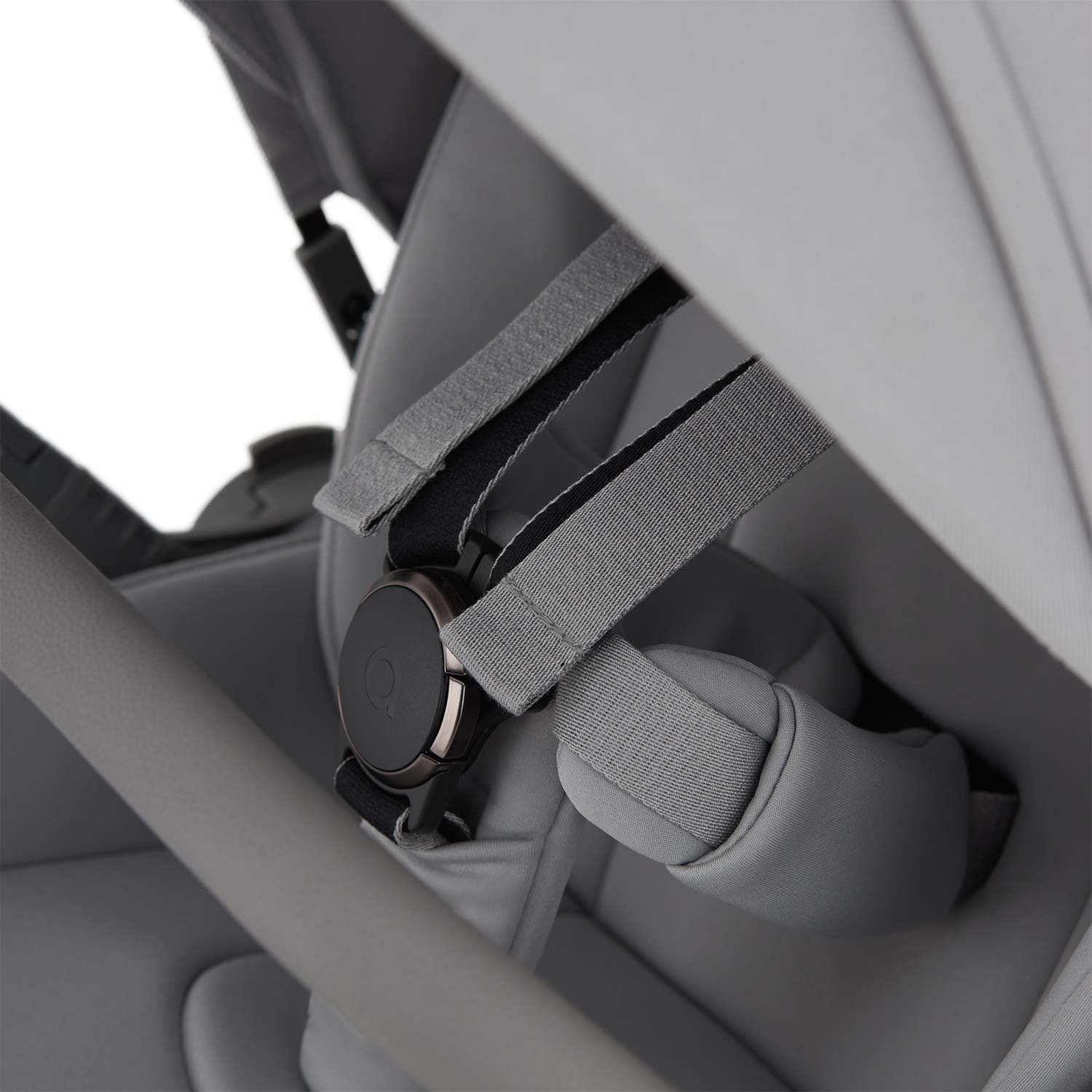 Коляска оснащена 5-точечными ремнями безопасности с мягкими наплечниками, которые легко регулируются и фиксируются с помощью кнопок. Магнитный бакл обеспечивает надежную фиксацию ремней, а мягкие плечевые накладки гарантируют безопасность и удобство. Бампер может быть снят или установлен в зависимости от потребностей малыша и предпочтений родителей.