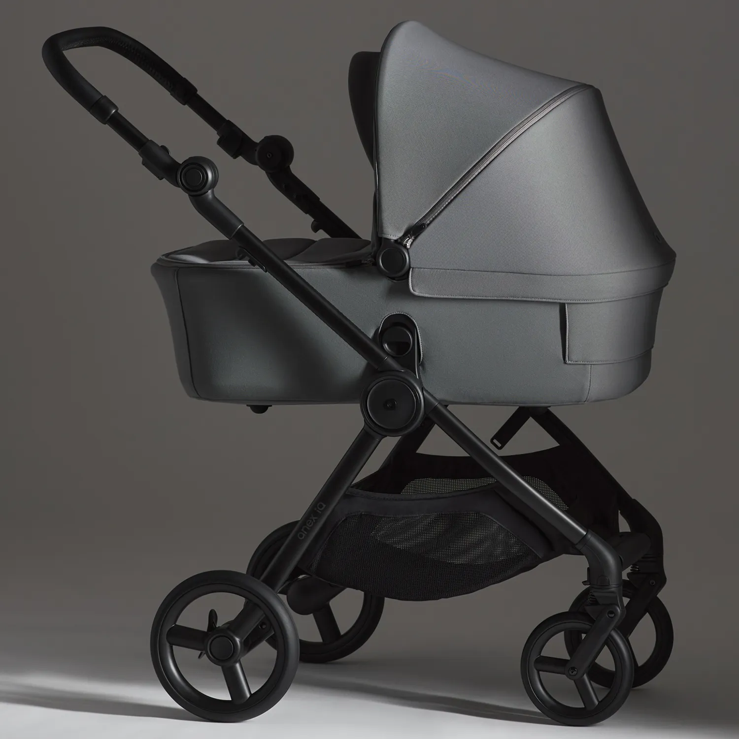 Шасси коляски 2 в 1 Anex iQ Basic имеет два положения ручки, что позволяет выбрать подходящую высоту для родителей разного роста. Прочная алюминиевая рама легко и плавно складывается благодаря механизму амортизации. Для удобства транспортировки на раме предусмотрена ручка.Air-free колеса обеспечивают комфортную поездку без проколов и накачивания колес. Два комплекта колес позволяют подобрать подходящую модель для разных условий и типов дорог. Большие колеса изготовлены из ER материала, который гарантирует хорошую проходимость даже по неровным поверхностям. Маленькие колеса выполнены из PU материала, который обеспечивает плавное и бесшумное движение. Шасси Anex iQ также имеет два положения блокировки передних колес, что обеспечивает устойчивость и маневренность в разных ситуациях.