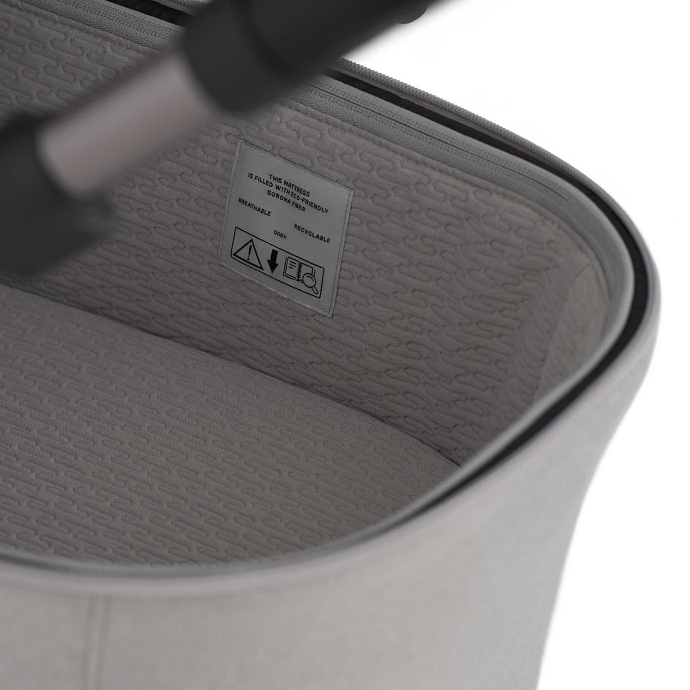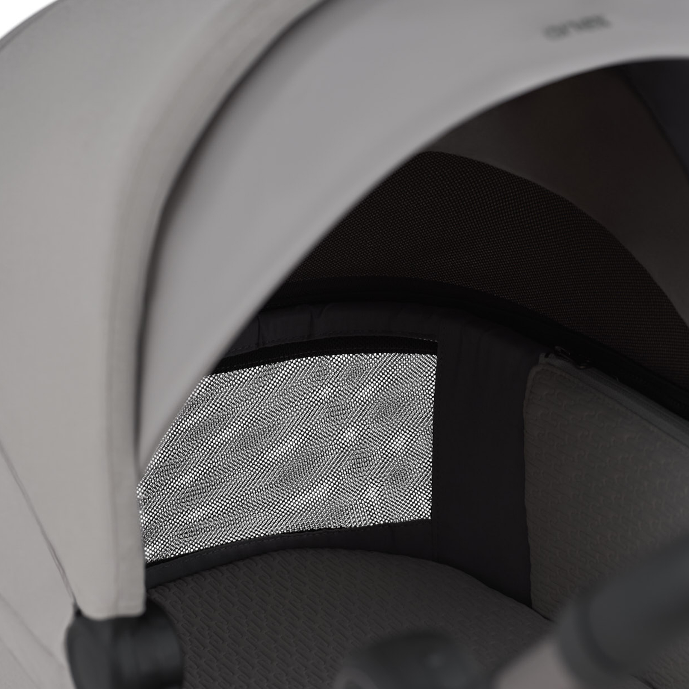 Внутри люлька выполнена из высококачественной дышащей бамбуковой ткани с паттерном, которая для удобства использования крепится на молнии. Матрасик — из дышащего материала Sorona. Капюшон коляски 2 в 1 Anex iQ Premium с дополнительной секцией UV 50+ защищает от вредных солнечных лучей и позволяет использовать люльку даже в солнечные дни безопасно.