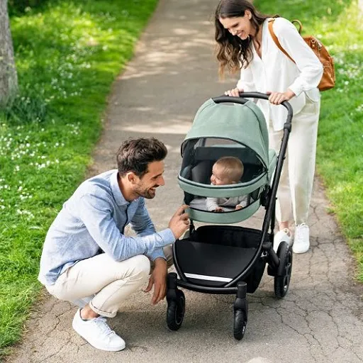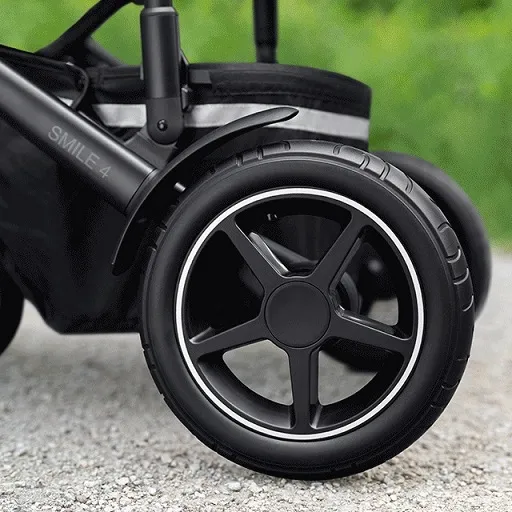 С коляской Smile IV не нужно заранее планировать маршруты прогулок, избегая грунтовых дорог или брусчатки. Центральная и передняя подвески в сочетании с непрокалываемыми шинами из прочной резины, наполненными вспененным полиуретаном, обеспечат плавность хода на любой местности.