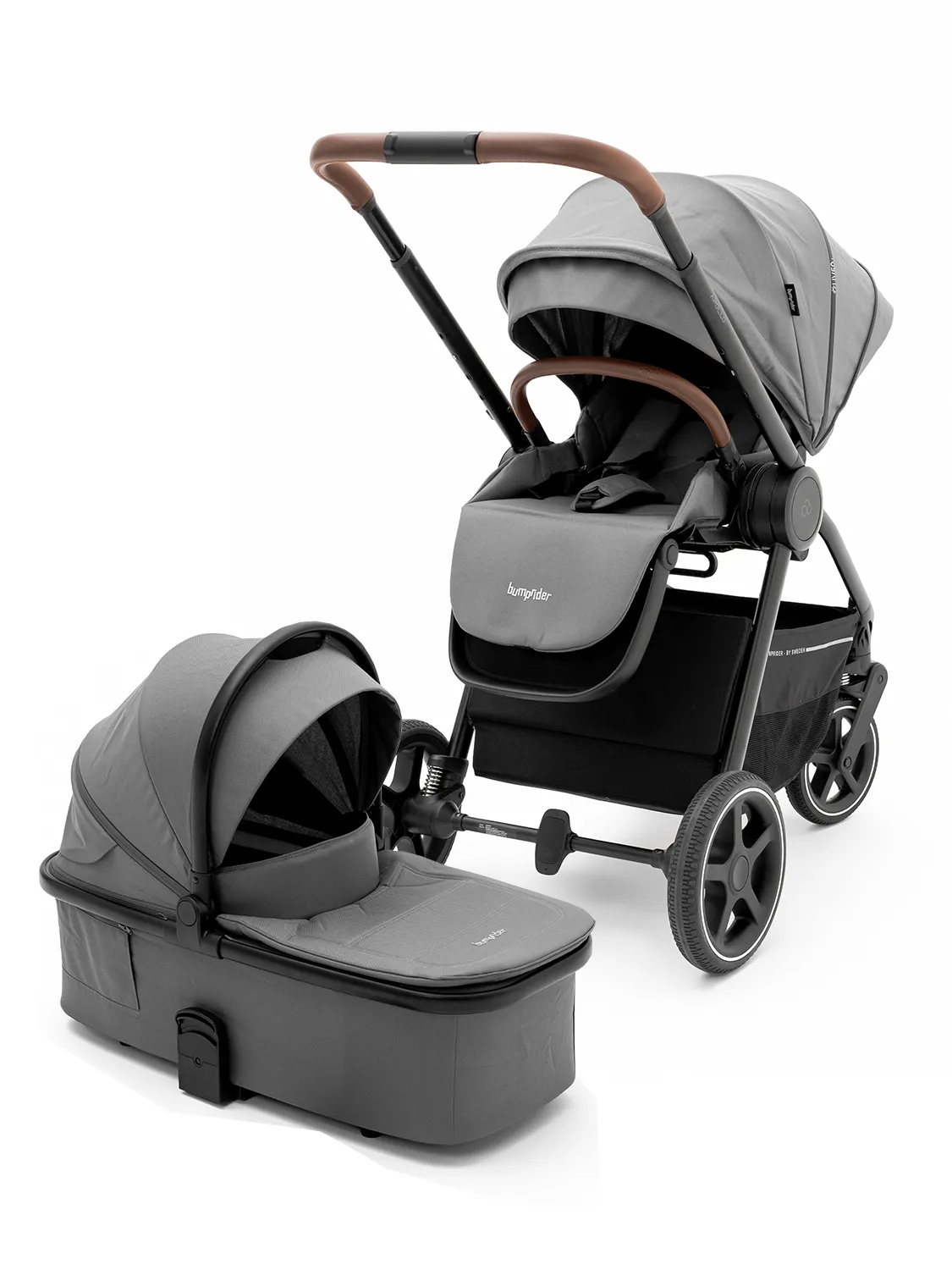 Bumprider Apollo имеет большие непрокалываемые колеса, телескопическую ручку и багажную корзину, в которой найдется место и для покупок, и для необходимых на прогулке вещей. При помощи адаптеров (входят в комплект) на шасси можно устанавливать автокресло группы 0+.