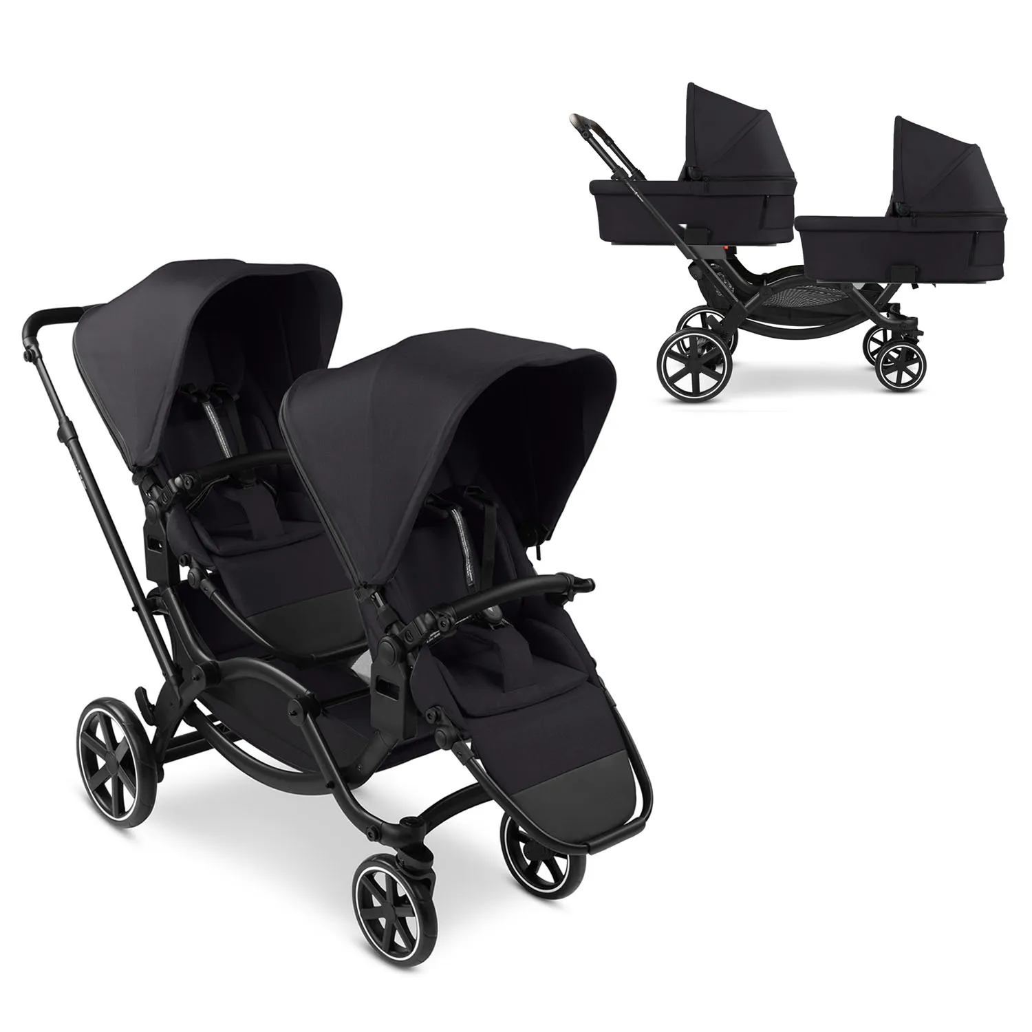 3. Прогулочная коляска для двойни (2 прогулочных блока лицом к миру, к маме, или друг к другу)