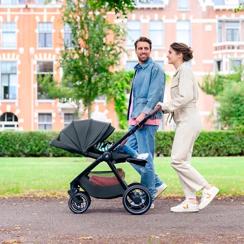 Коляска имеет современные колеса, устойчивые к проколам и износу, с мягкой подвеской для комфортных прогулок. Передние колеса поворотные с возможностью фиксации при необходимости. Эргономичная кожаная ручка выдвигается в 5 различных положениях по высоте для удобства родителей.