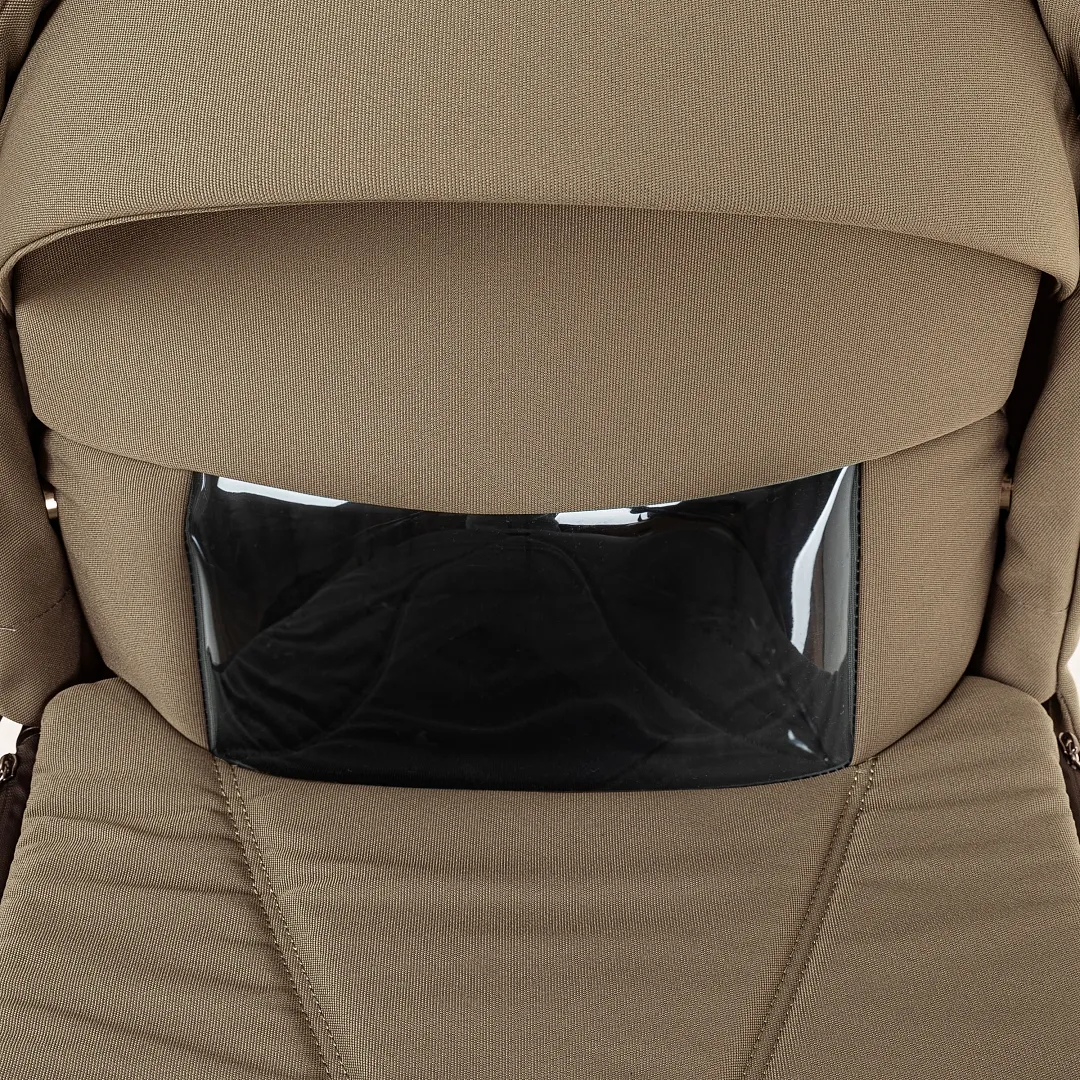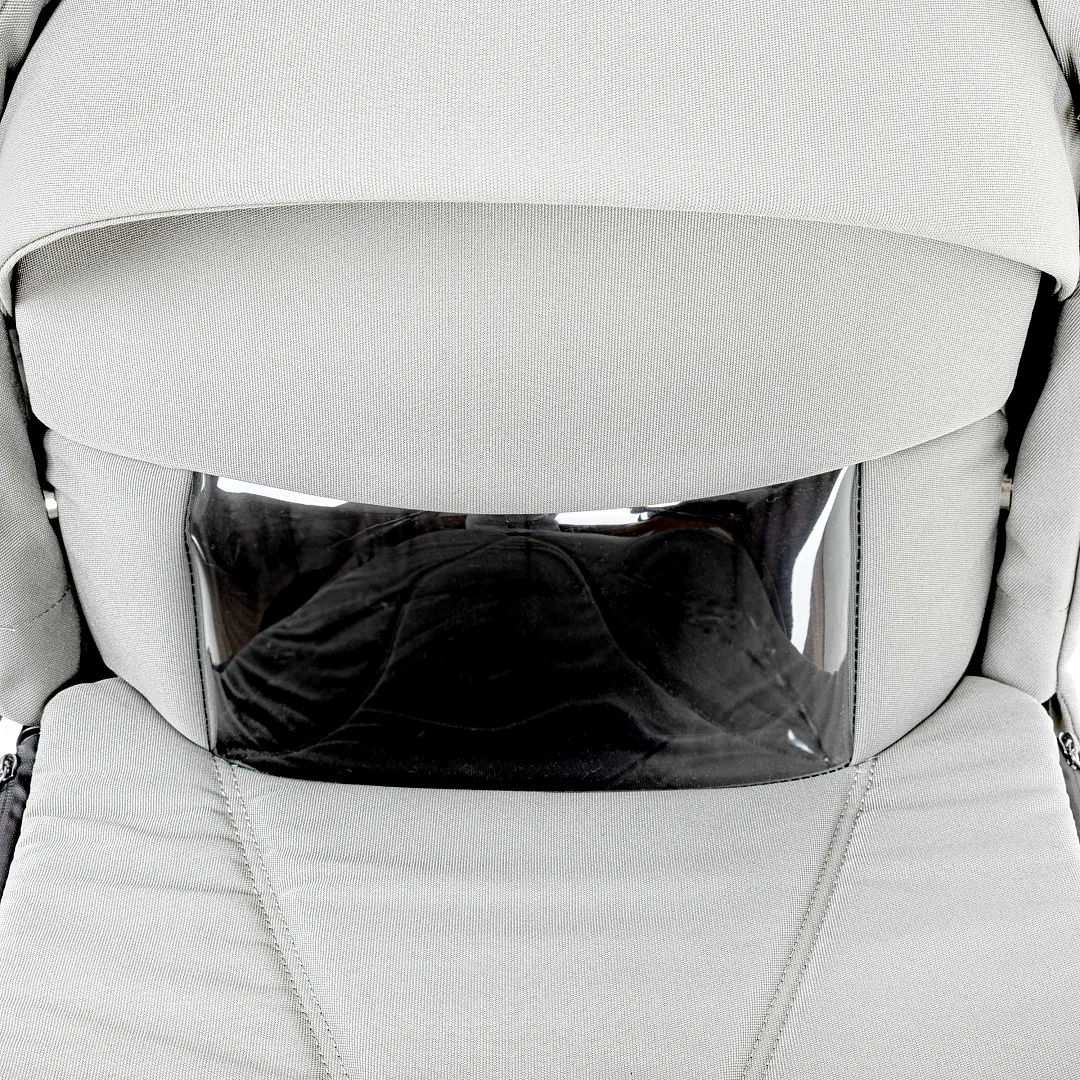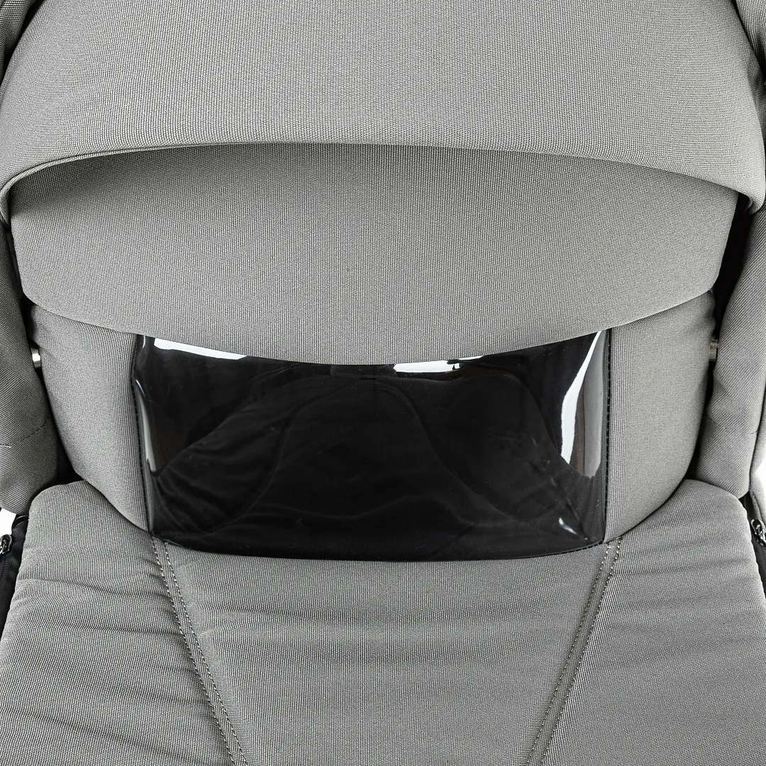 Накидка на люльку имеет дополнительный отворот со смотровым окном, сам отворот полностью закрывает ребенка от непогоды и крепится за счёт магнитов.