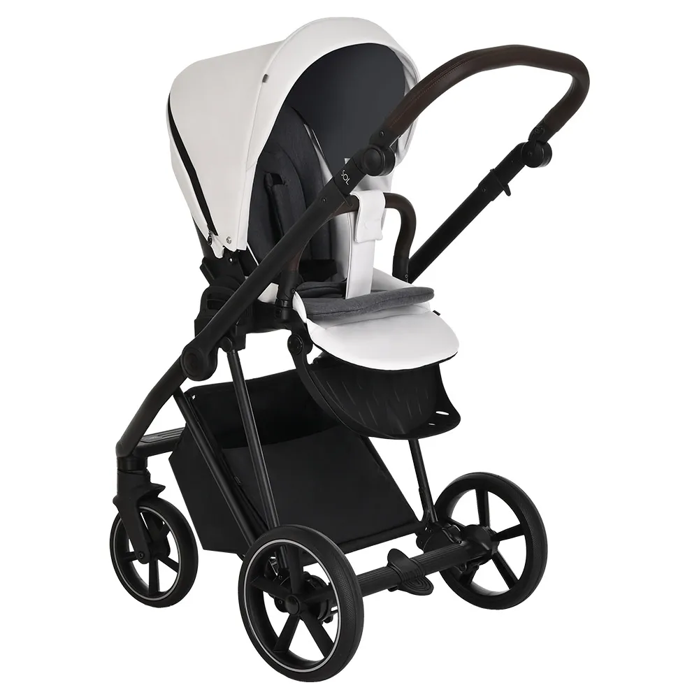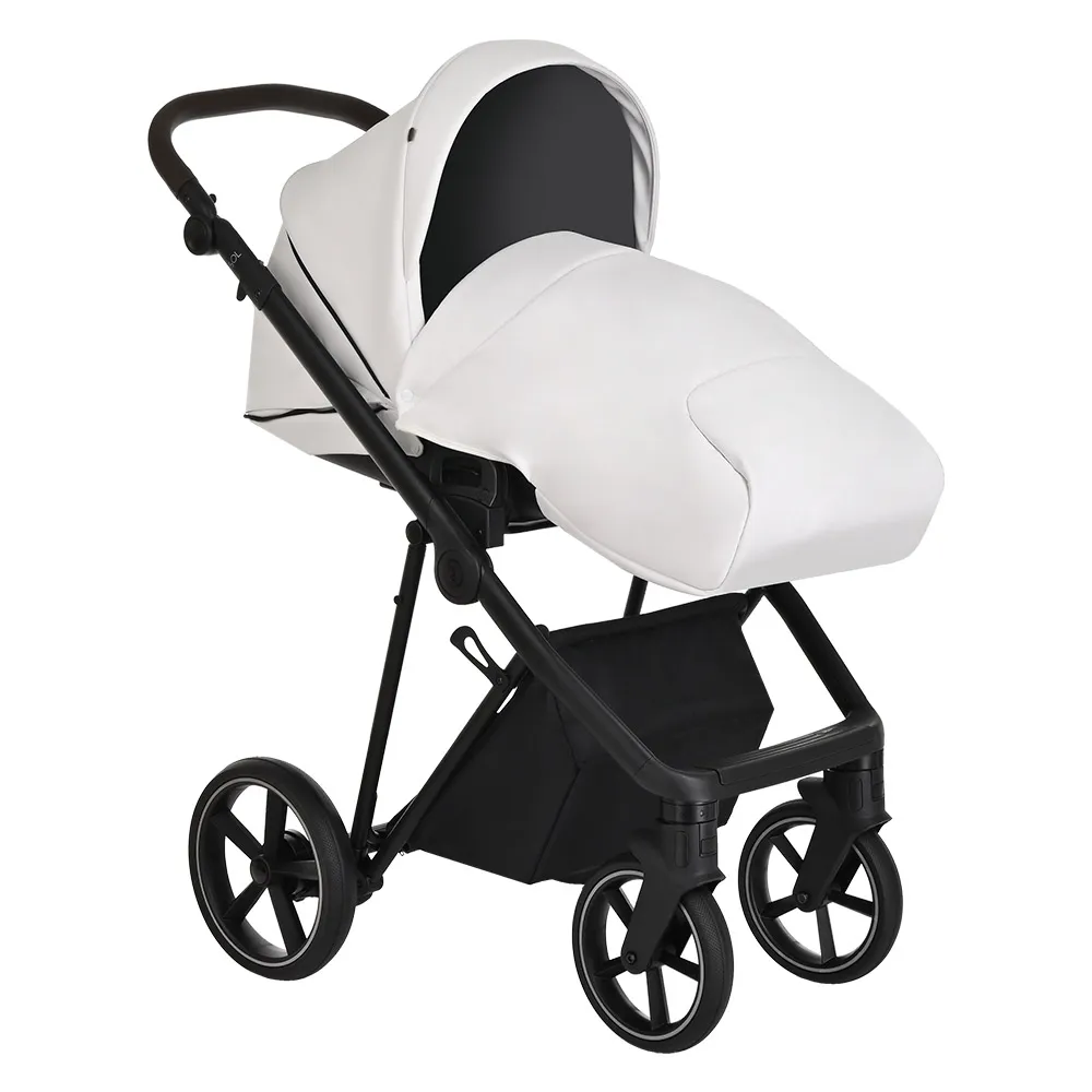 На основании рамы крепится компактная стильная корзина. Несмотря на свой компактный вид, корзина довольно вместительная и имеет возможность увеличения. В комплект также входят сумка для мамы, матрасик для пеленания, солнцезащитный тент, москитная сетка, дождевик.