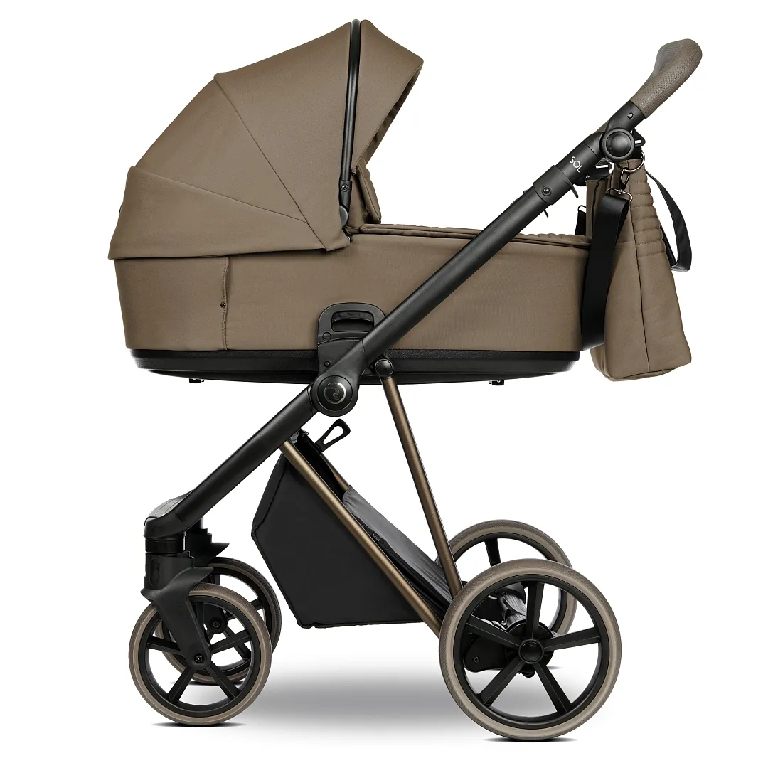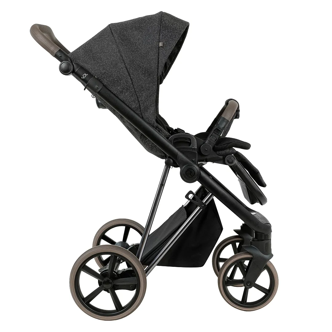 - основные отличия от модели Sol Luxury: эксклюзивные новые ткани, прошивка на накидке на люльку и на родительской сумке, цветные колеса, родительская ручка в цвет колес, новый матрасик в спальном блоке