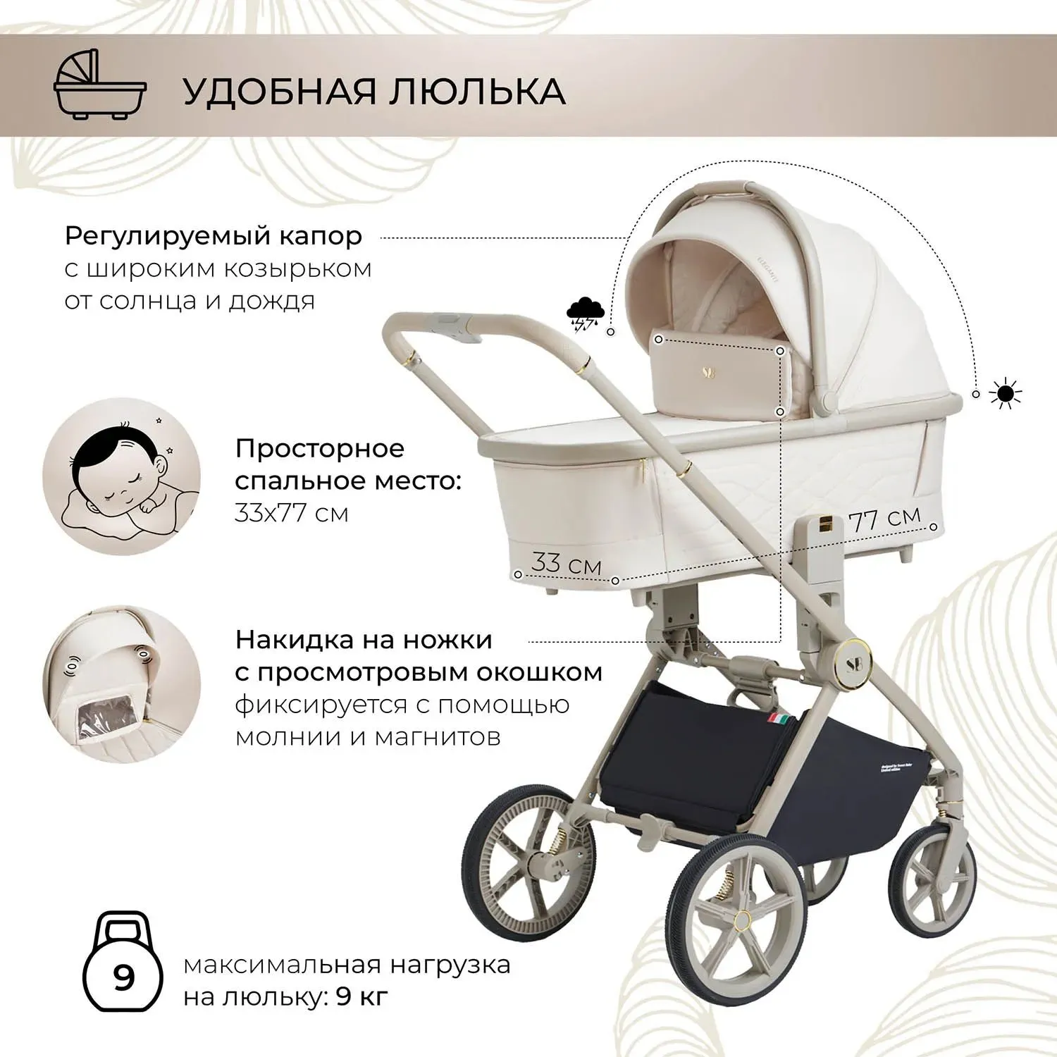 Коляска 2 в 1 Sweet Baby Elegante представляет собой идеальное сочетание изысканности и функциональности. Благодаря использованию премиальных материалов и современных технологий, она становится надежным спутником для комфортных прогулок как в городе, так и за его пределами.