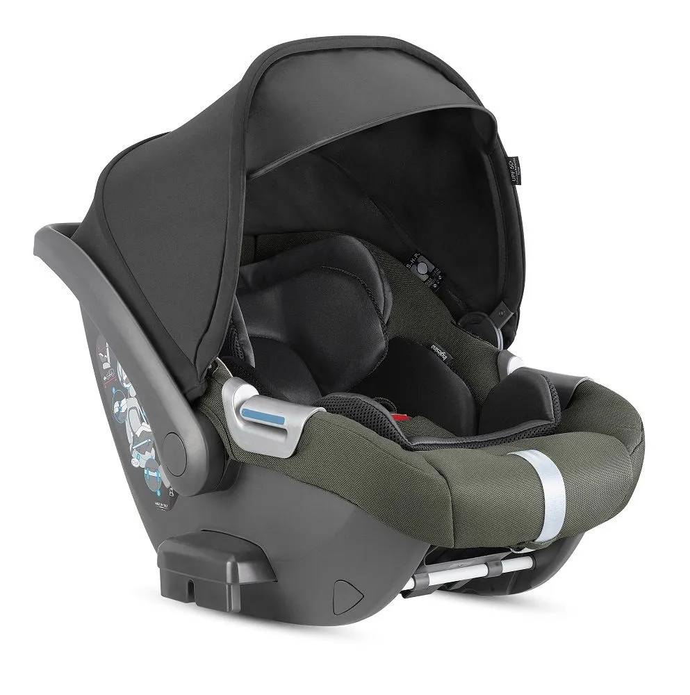 В комплектацию входит автокресло Inglesina Cab, сертифицированное согласно европейскому стандарту ECE R44/04 для группы 0+ (от 0 до 13 кг). Автокресло устанавливается только против хода движения. Оснащено регулируемым по высоте подголовником со встроенными 3-точечными ремнями безопасности, которые настраиваются по мере роста ребенка. Ремни в области плеч и паха оснащены мягкими вставками из лайкры. Автокресло имеет легко регулируемую в 4 позициях ручку для переноски и может устанавливаться в машине без использования базы.