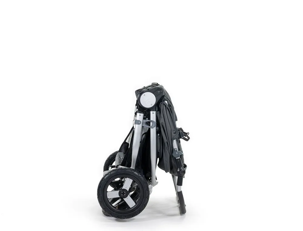 Устойчивость детского изделия – обязательное условие, поэтому конструкция Bumbleride Indie тщательно просчитана. Она имеет три точки опоры, но правильно расположенный центр тяжести позволяет доверять этой модели не меньше, чем 4-колёсной. Рама выполнена из анодированного алюминия, она лёгкая и прочная. Шины надувные, для них прилагается специальный насос. Диаметр всех колёс одинаковый (около 30 см), а функции разные. Переднее поворотное с амортизацией служит для манёвренности и может фиксироваться при помощи небольшого рычажка; а задние, также оснащённые амортизацией и стояночным тормозом, несут на себе основную нагрузку.
