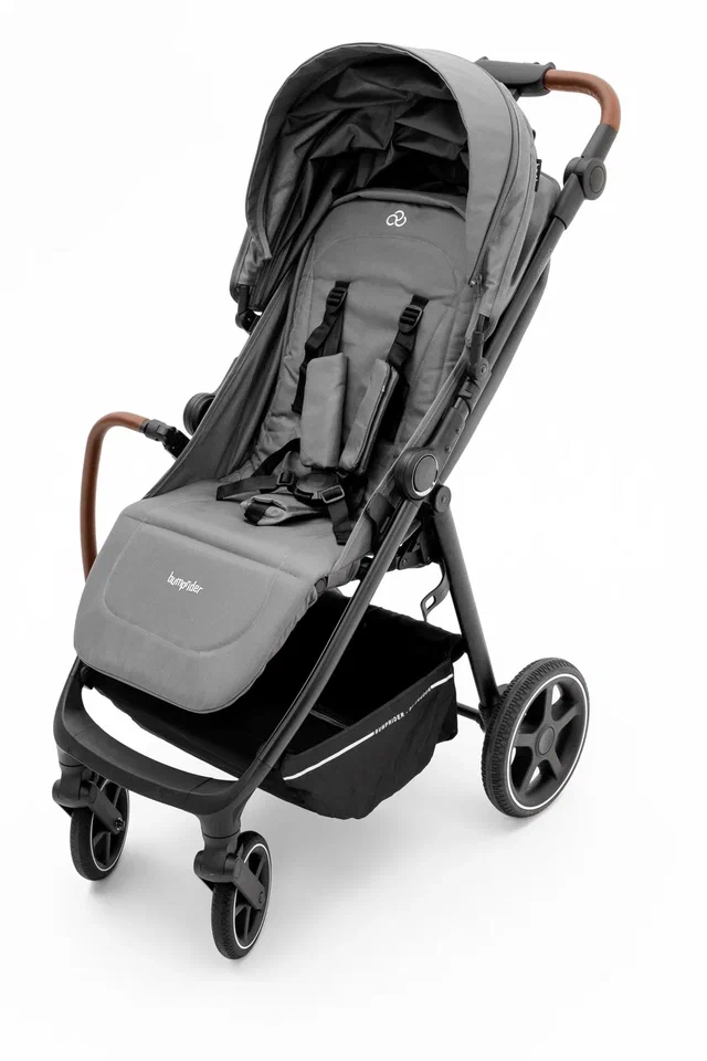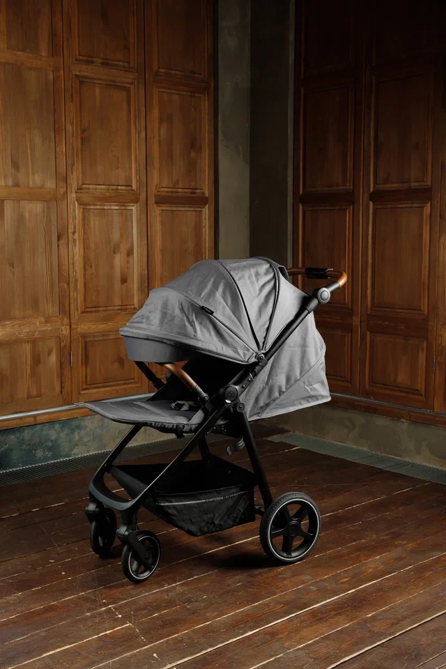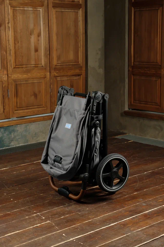 Отделанная эко-кожей ручка регулируется по высоте под рост родителей. Коляска компактно складывается одной рукой по типу книжки, не занимая много места в багажнике автомобиля. Большие непрокалываемые колеса отлично едут даже по бездорожью, создавая комфорт на прогулке.