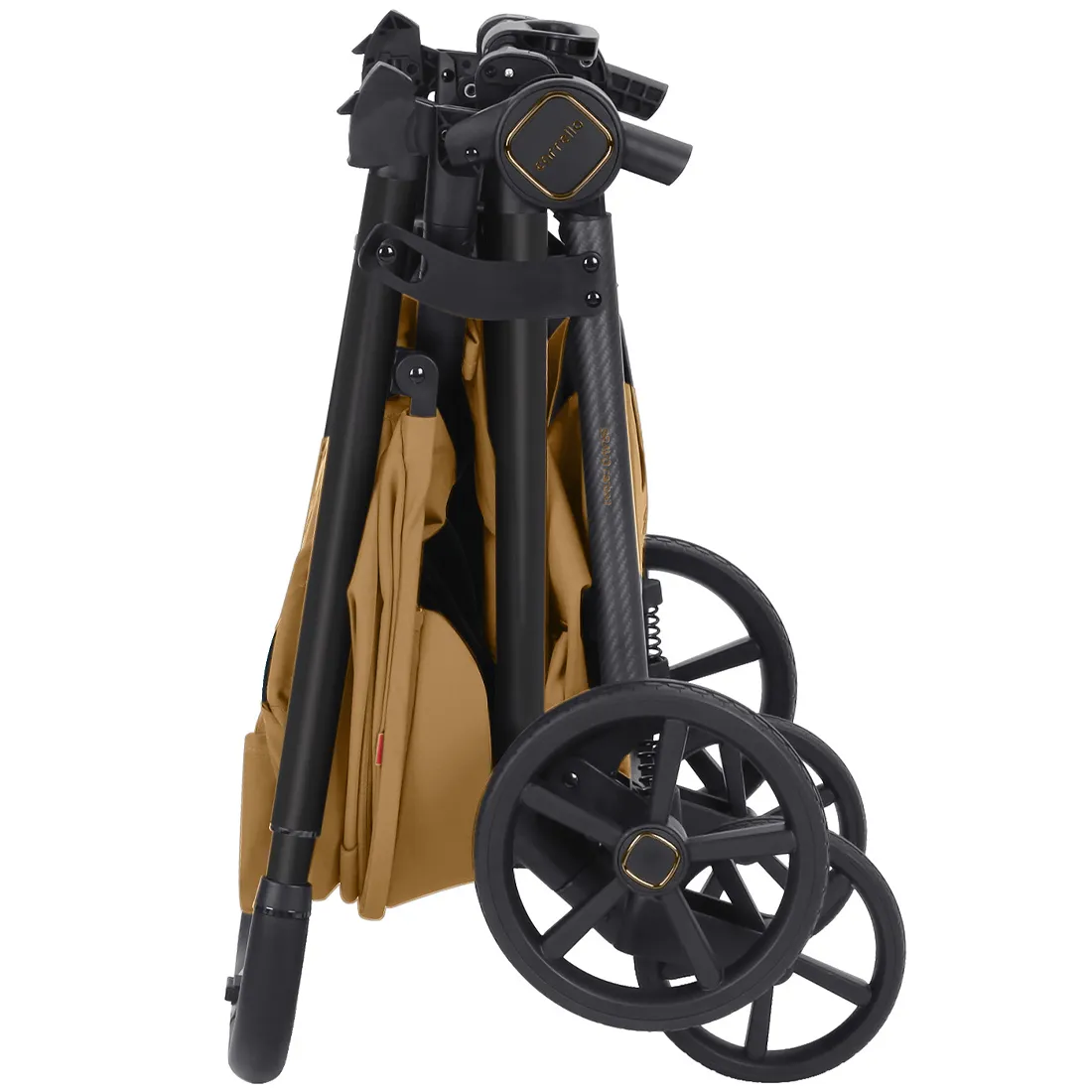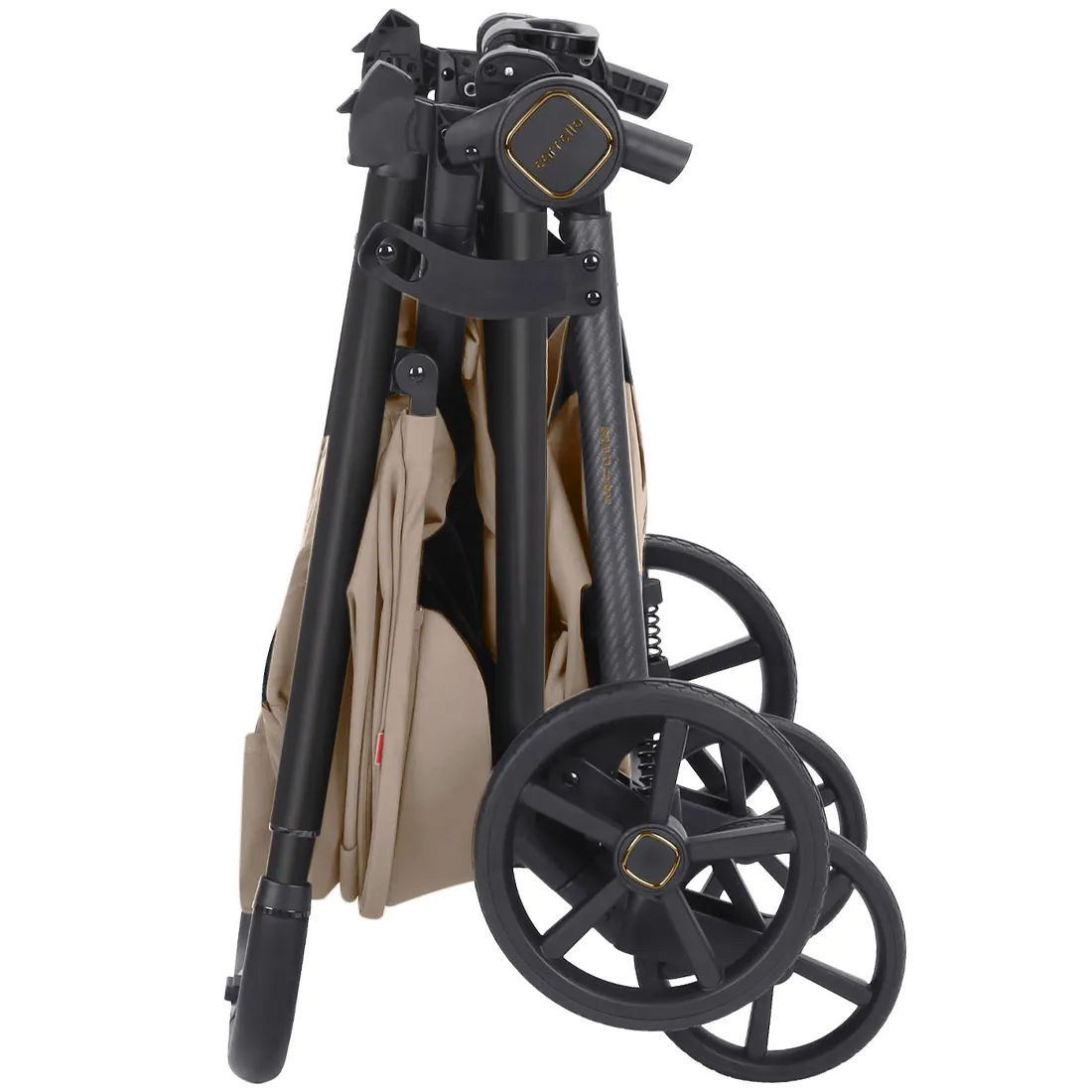 Коляска складывается сидением внутрь - текстиль сиденья защищен от загрязнений. В сложенном виде коляска блокируется и сохраняет вертикальное положение.